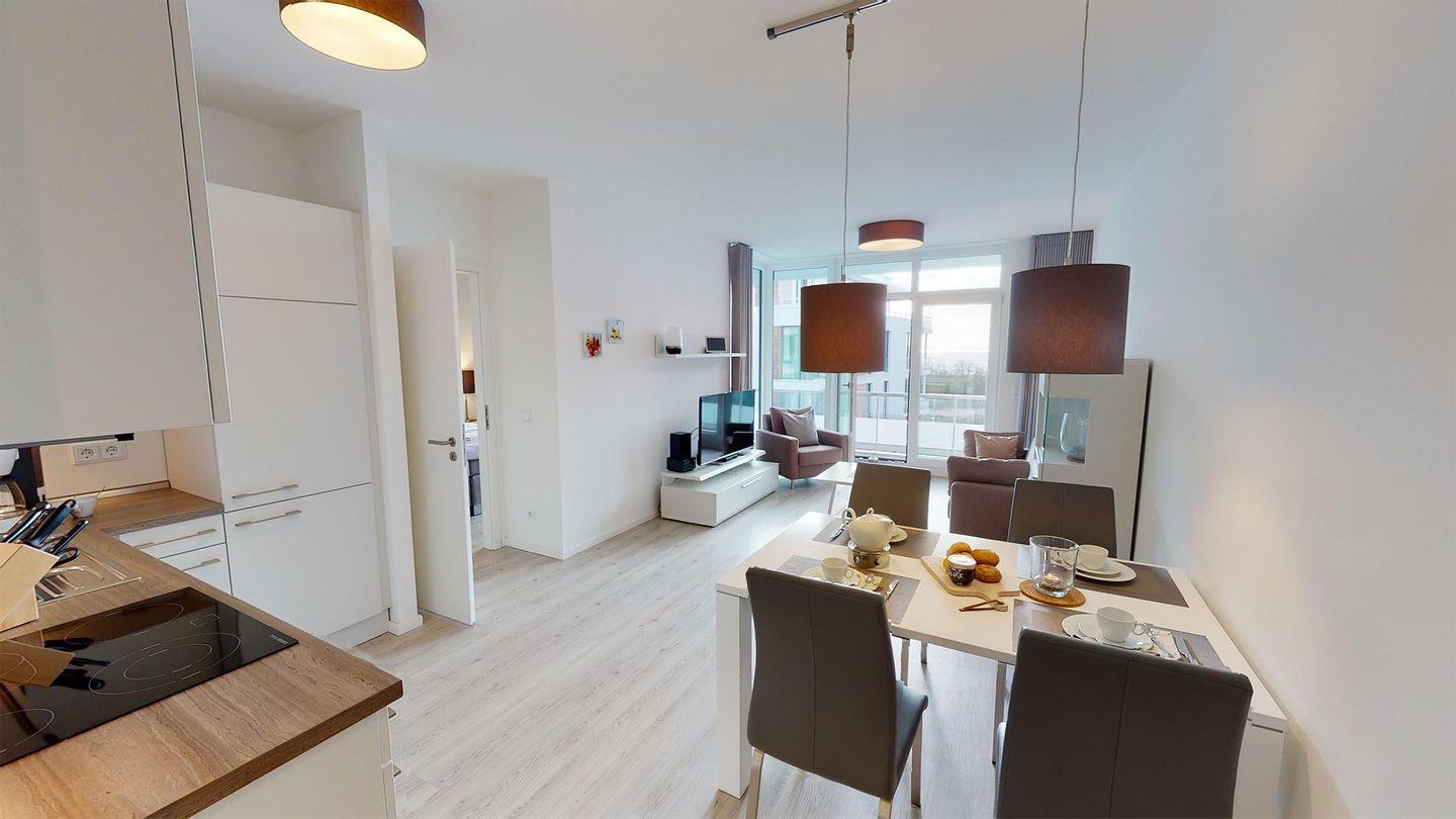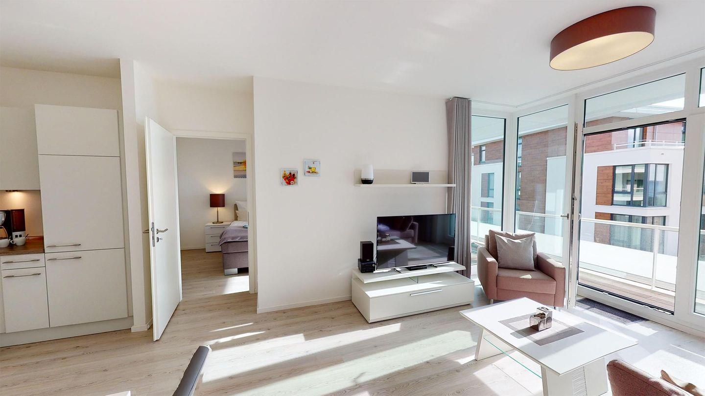 Der Flur führt Sie in das Badezimmer mit Dusche und Badewanne. Zurück auf dem Flur leitet dieser Ihren Weg direkt in das Herzstück des Apartments - den Wohnbereich. Eine offene Einbauküche, ein Essbereich sowie eine Sofaecke laden zum Verweilen ein. Die Fensterfront gibt den Blick frei auf die Ostsee. Weiterhin gibt es ein Schlafzimmer mit komfortablem Boxspring-Doppelbett. Es stehen zudem ein Kinderbett sowie Hochstuhl zur Verfügung.