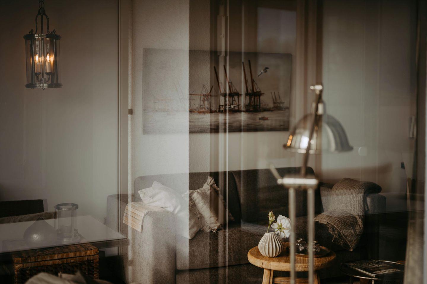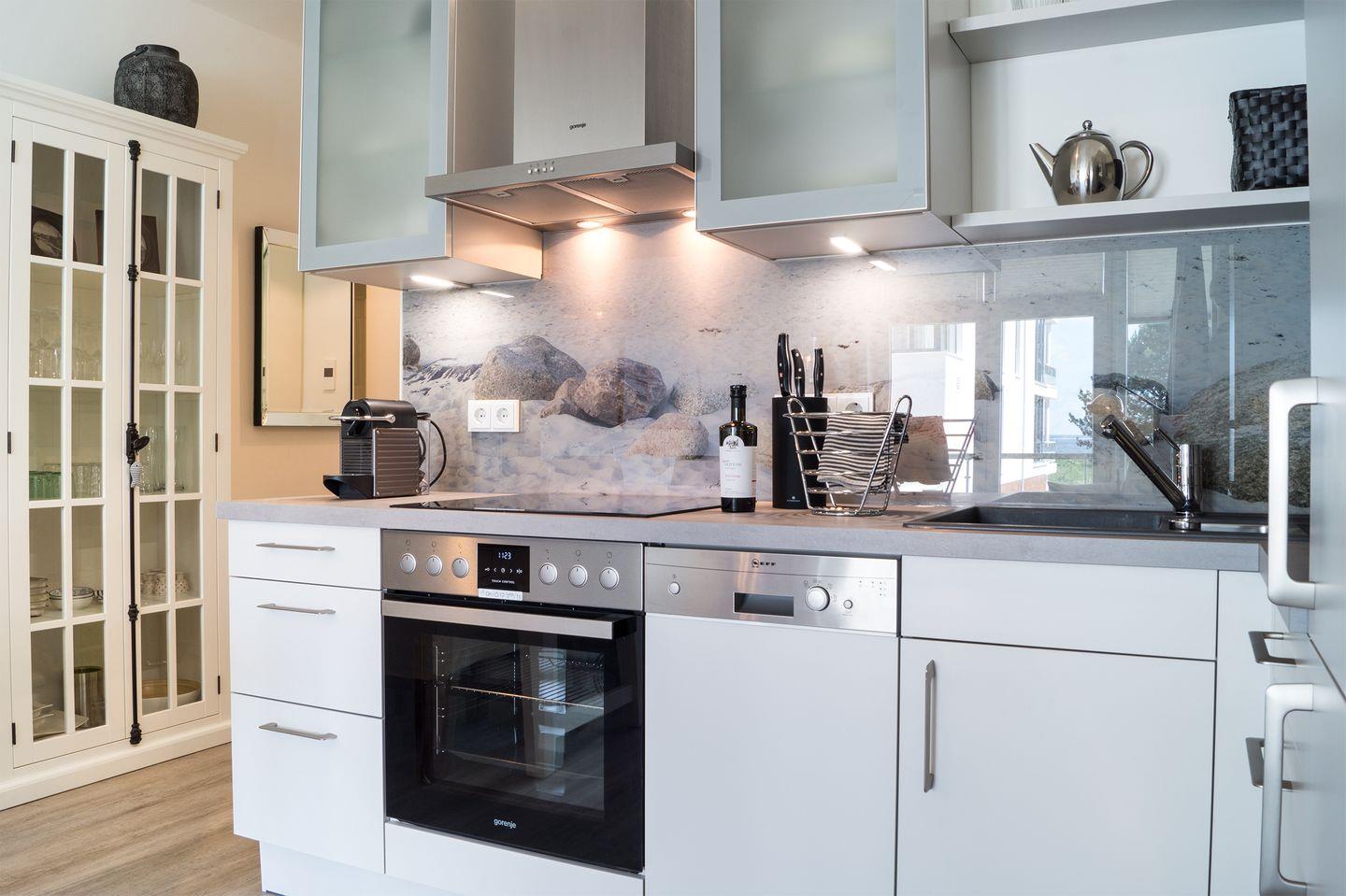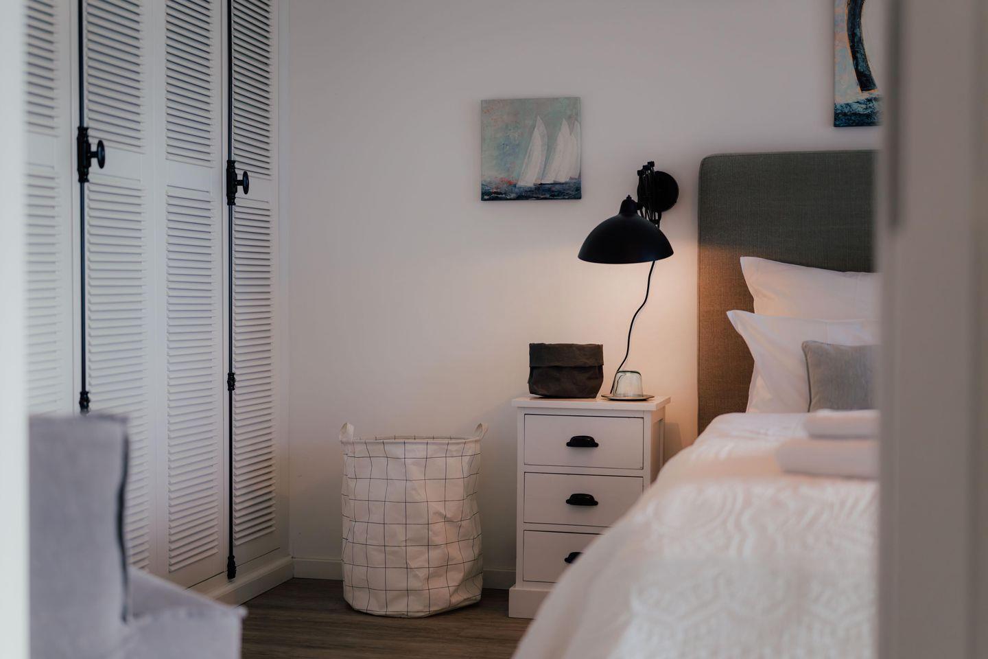 Verweilen Sie im lichtdurchfluteten Wohnzimmer auf dem Sofa oder genießen Sie den Meerblick aus der Fensterfront. Das Sofa bietet eine weitere Schlafmöglichkeiten für zwei Personen. Angrenzend an das Wohnzimmer finden Sie einen Essbereich sowie eine offene, gut ausgestattete Küchenzeile mit einer Nespresso-Maschine. Des Weiteren gibt es ein modernes Badezimmer mit Dusche und Badewanne sowie ein Schlafzimmer mit einem Boxspring-Doppelbett.
