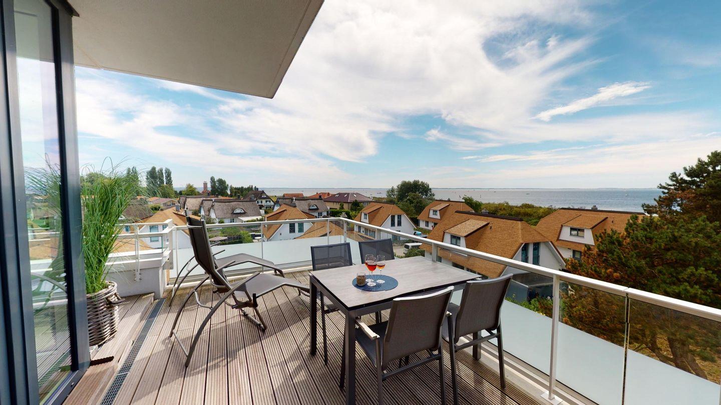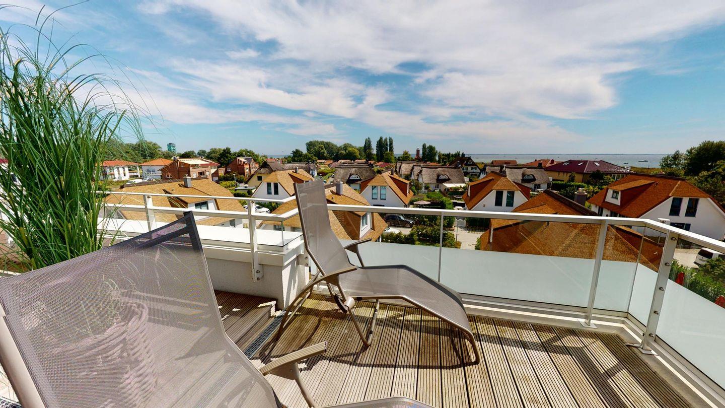 Von der großen umlaufenden Dachterrasse in Ost-/Südausrichtung haben Sie einen fantastischen Ostseeblick. Hier laden der Strandkorb, Terrassenmöbel, ein Elektrogrill sowie zwei Liegen zum Relaxen ein.