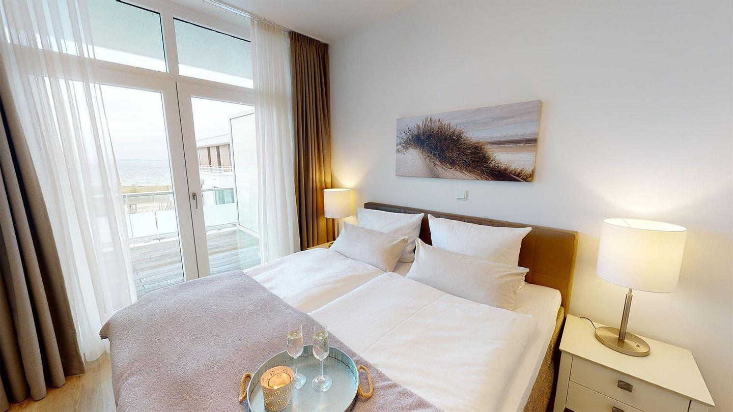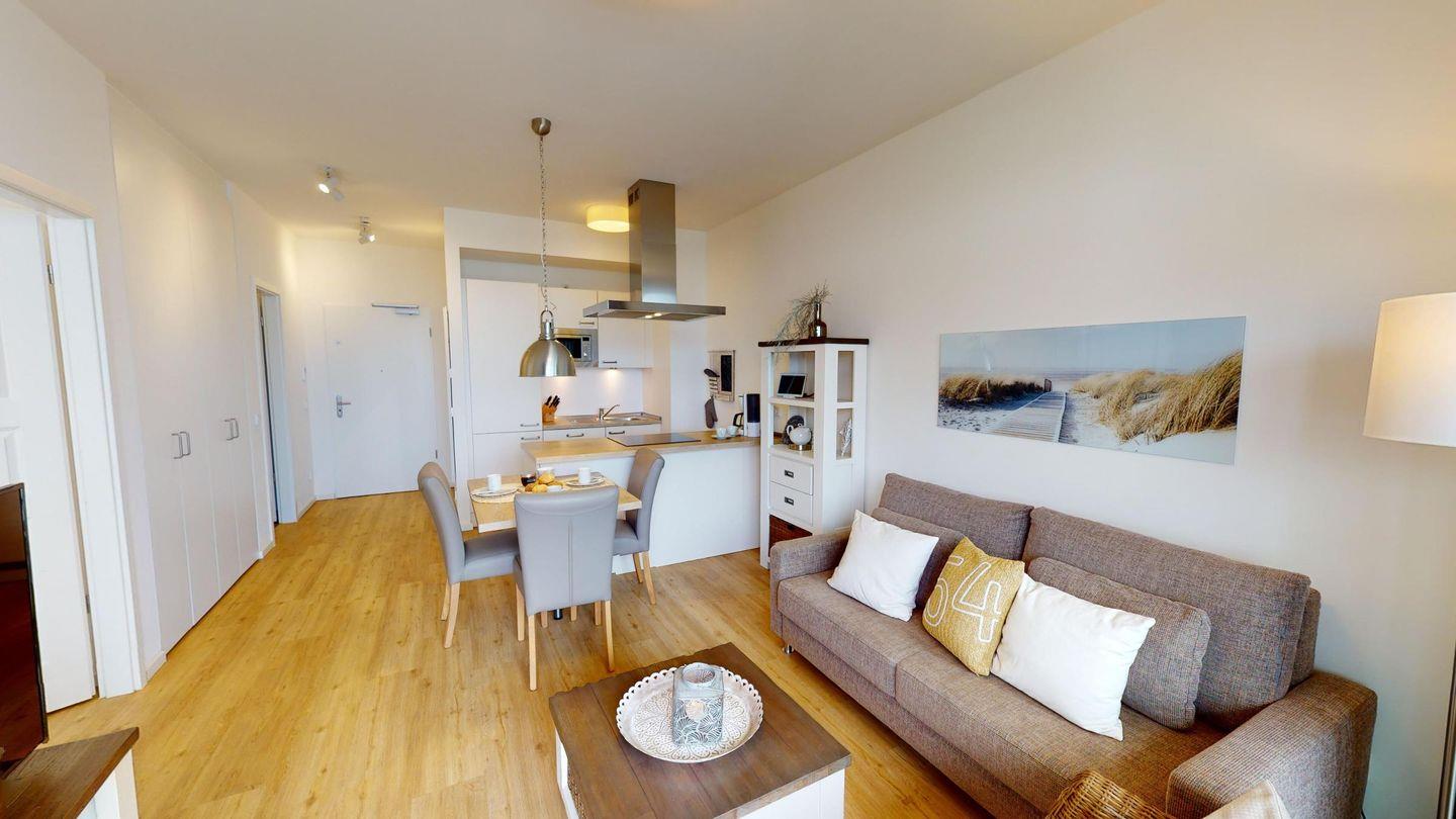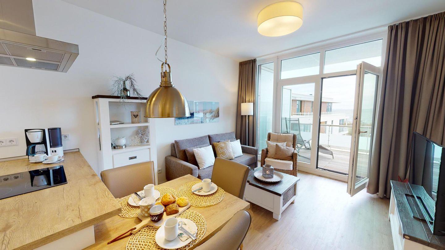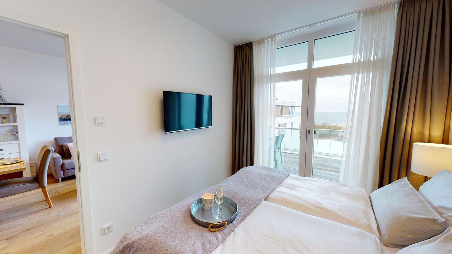 Sie werden begrüßt von einem Flur, der direkt den Blick auf die Ostsee freigibt. Rechterhand befindet sich das Badezimmer mit Dusche und Badewanne. Das Herzstück des Apartments ist das helle Wohnzimmer mit Essbereich und einer gut ausgestatteten Küche. Genießen Sie den Blick aus der großen Fensterfront direkt auf die Ostsee! Weiterhin gibt es ein Schlafzimmer mit einem Boxspring-Doppelbett mit herrlichem Meerblick. Die Couch im Wohnzimmer dient als Schlafmöglichkeit für eine Person.