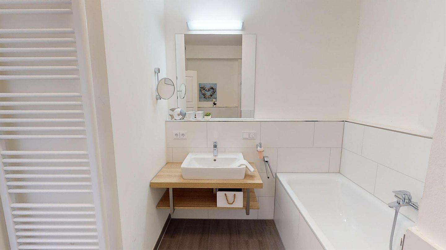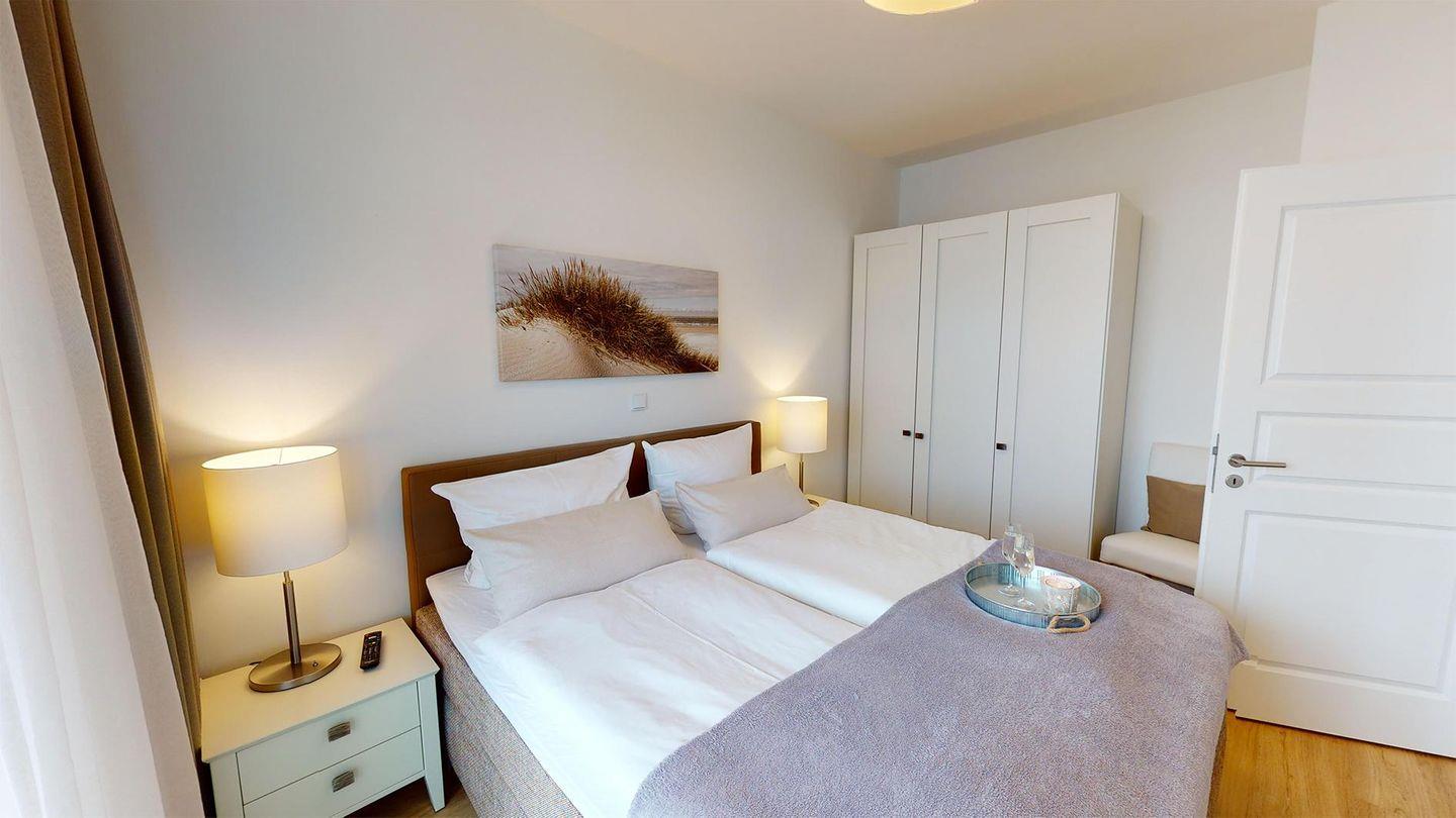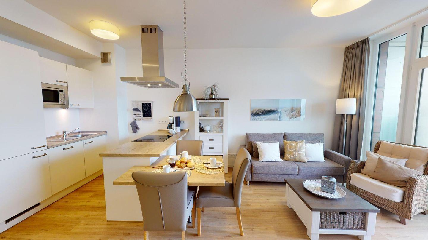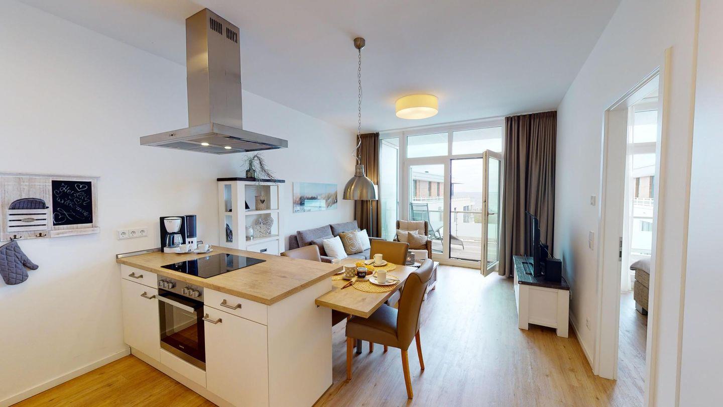 Sie werden begrüßt von einem Flur, der direkt den Blick auf die Ostsee freigibt. Rechterhand befindet sich das Badezimmer mit Dusche und Badewanne. Das Herzstück des Apartments ist das helle Wohnzimmer mit Essbereich und einer gut ausgestatteten Küche. Genießen Sie den Blick aus der großen Fensterfront direkt auf die Ostsee! Weiterhin gibt es ein Schlafzimmer mit einem Boxspring-Doppelbett mit herrlichem Meerblick. Die Couch im Wohnzimmer dient als Schlafmöglichkeit für eine Person.