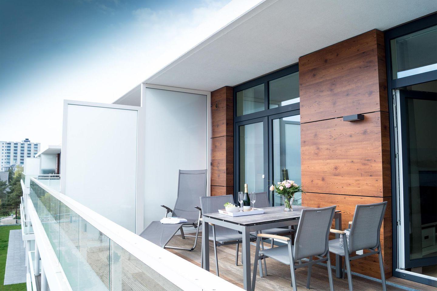 Die 25 m² große Dachterrasse erreichen Sie vom Wohnbereich oder vom Schlafzimmer aus. Hier stehen bequeme Terrassenmöbel für Sie bereit, außerdem haben Sie einen traumhaften Ostseeblick!