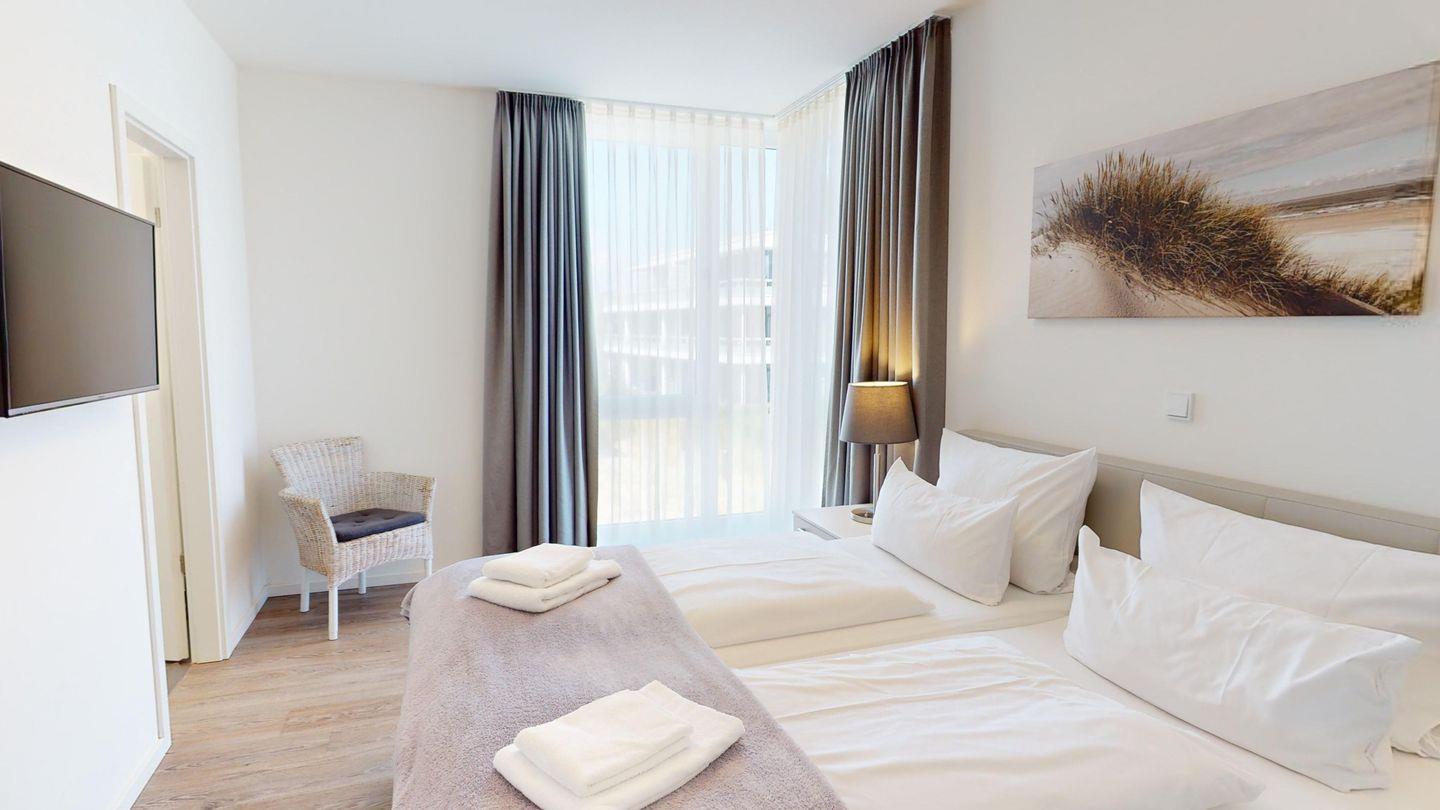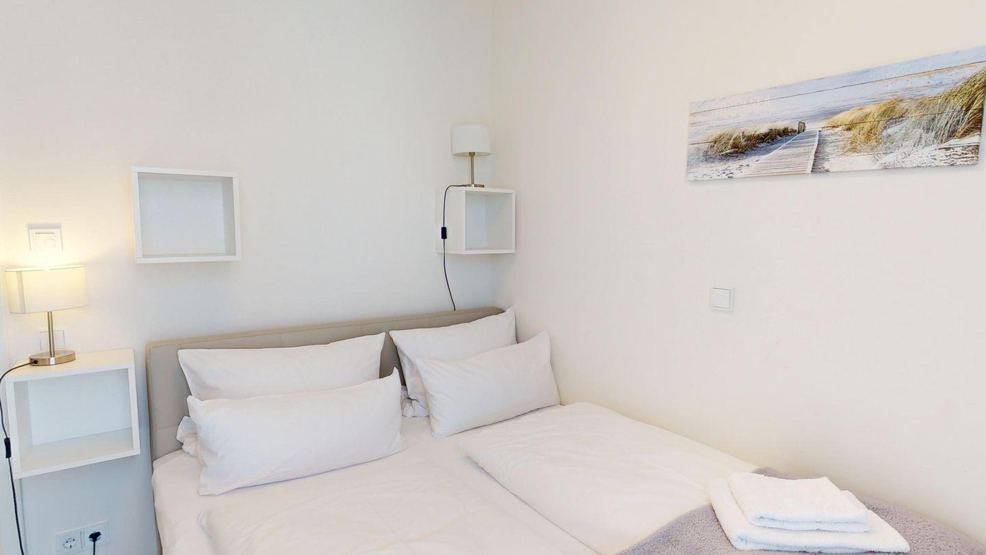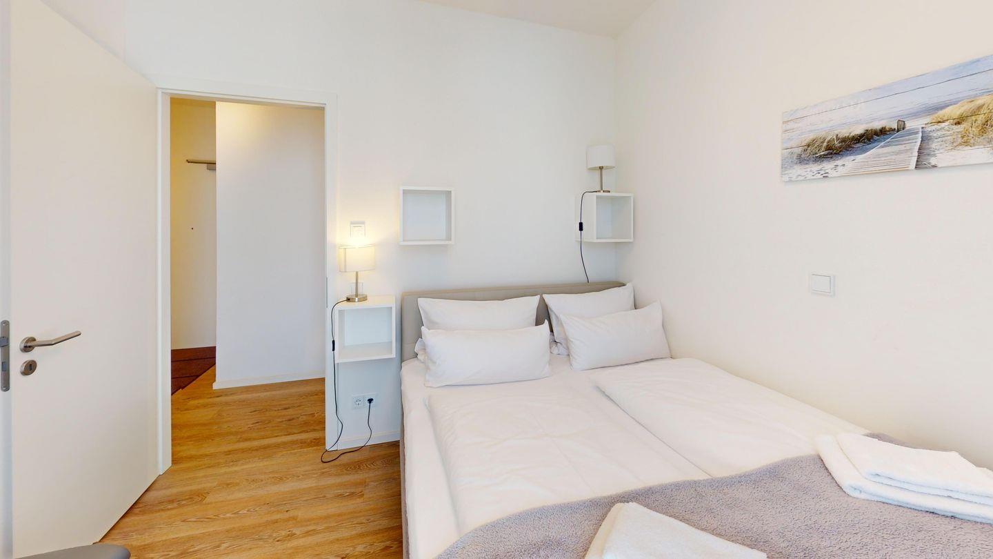Die Ferienwohnung hat zwei getrennte Schlafzimmer, eins davon mit einem eigenen Badezimmer mit Dusche. In der Wohnung ist ein weiteres Bad mit Dusche vorhanden, was gerade bei Belegung mit bis zu vier Personen sehr komfortabel ist.
