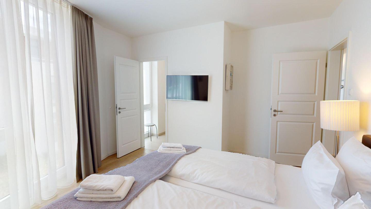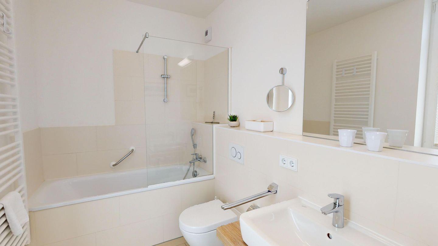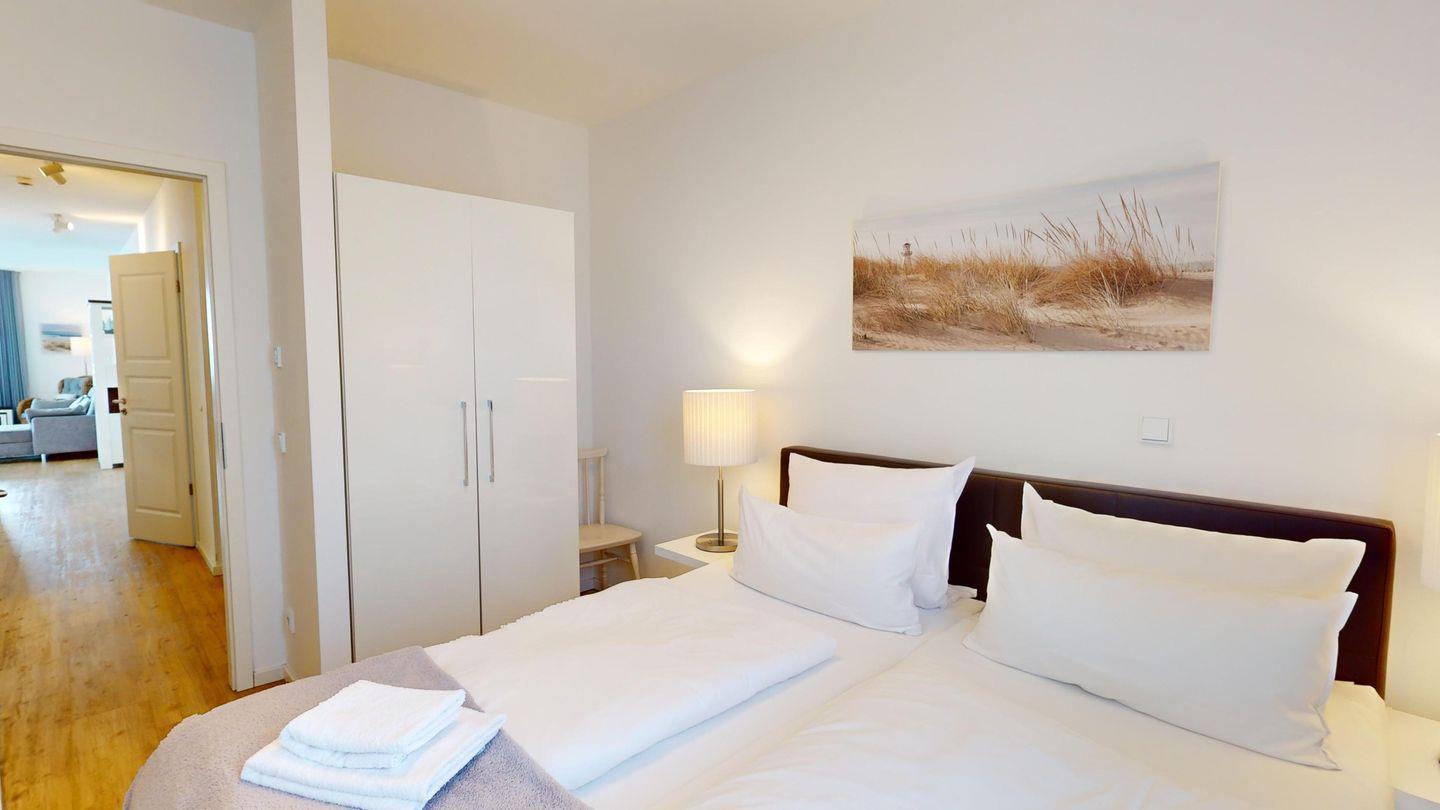 Die 4-Zimmer-Wohnung im zweiten Obergeschoss ist mit 99 m² für sechs Personen ausgerichtet. Im großen Wohnzimmer mit Küchenzeile genießen Sie Ihre Mahlzeiten und können gesellschaftliche Abende verbringen. Zwei Schlafzimmer für je zwei Erwachsene mit komfortablen Boxspringbetten und ein drittes Schlafzimmer für Kinder, mit einem Einzelbett und einem zusätzlichen, ausziehbaren "Kojenbett". Dazu zwei Bäder (je eines mit Dusche und eines mit Badewanne und Dusche) bieten größtmöglichen Komfort. Vom Balkon haben Sie den perfekten Meerblick über die Lübecker Bucht. Das Haus E liegt in erster Reihe.