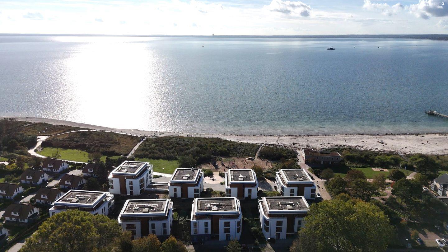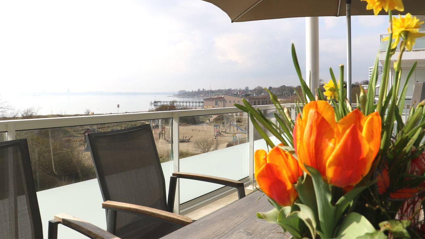 Aus dem offenen Wohn-/Essbereich, mit vollständig eingerichteter Küche, genießen Sie die uneingeschränkte Aussicht nach Südwesten auf die Ostsee und die Lübecker Bucht. Der überdachte Südbalkon lädt mit sechs Sitzplätzen und zwei Liegen zum Verweilen und genießen des einmaligen Meerblicks ein.
