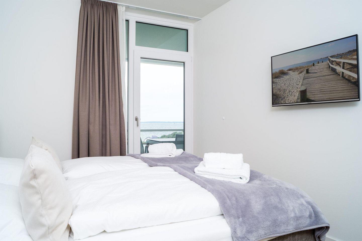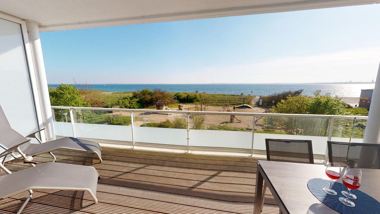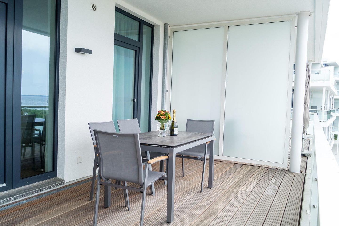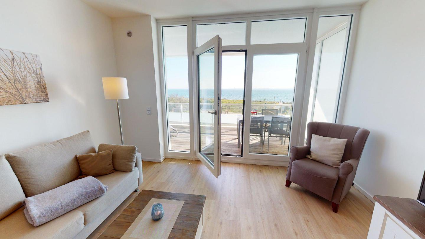 Der helle Flur mit großem Spiegel führt Sie linkerhand in das schöne Badezimmer. Hier erwarten Sie eine Badewanne und eine Dusche, das Urlaubsgefühl stellt sich sofort ein! Zurück auf dem Flur führt Sie ihr Weg direkt in das Herzstück des Apartments, in den Wohnbereich. Eine offene Einbauküche, ein einladender Essbereich sowie eine gemütliche Sofaecke laden zum Verweilen ein! Genießen Sie den Blick aus dem Fenster, denn die Ostsee lacht Ihnen entgegen! Über das Wohnzimmer gelangen Sie in den letzten Raum des Apartments, das Schlafzimmer. Hier stehen ein komfortables Boxspring-Doppelbett, ein geräumiger Kleiderschrank und ein Flachbildfernseher für Sie bereit. Auf den schönen Balkon gelangen Sie sowohl über das Wohnzimmer, als auch über das Schlafzimmer. Zur Ausstattung gehören zwei Sonnenliegen sowie ein Balkontisch mit vier Stühlen. Der frontale Meerblick wird sie begeistern!