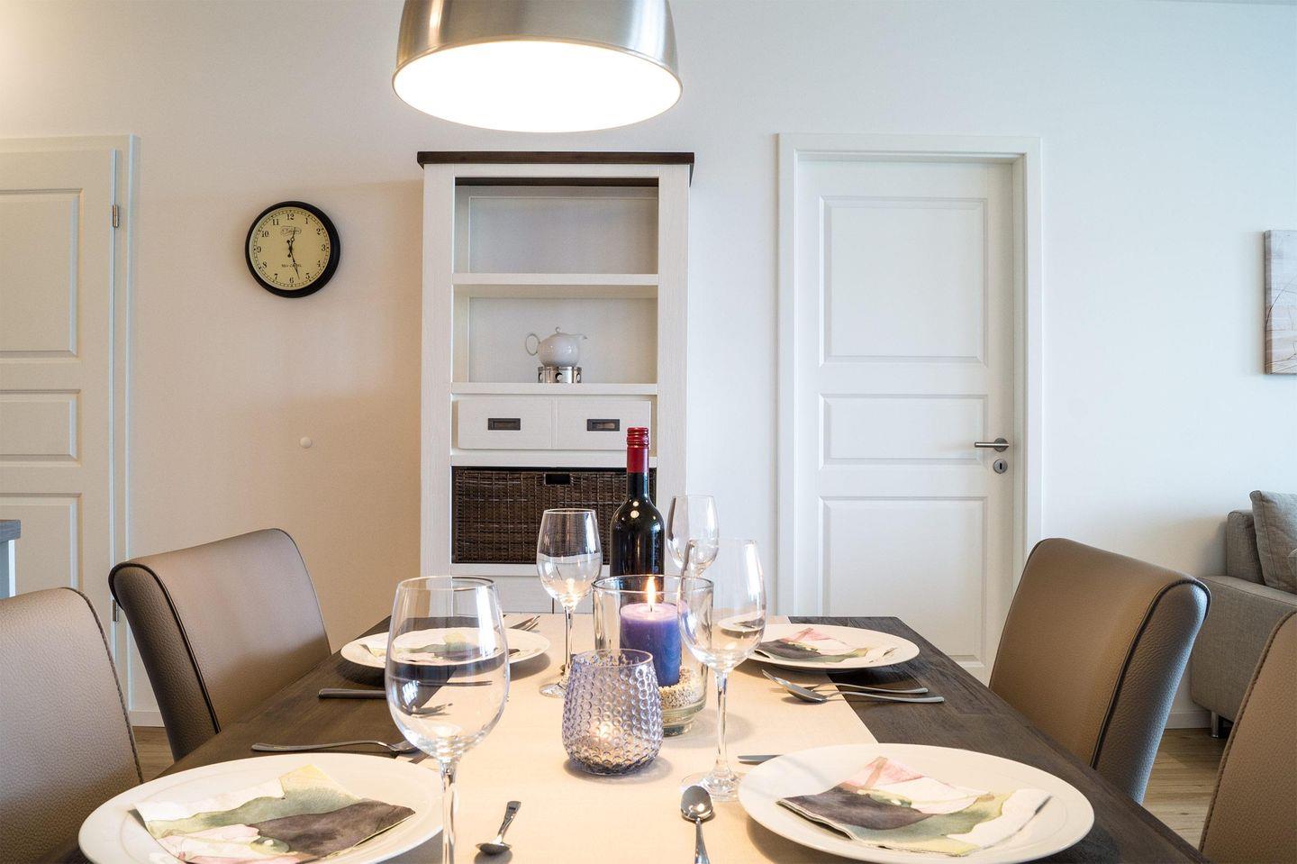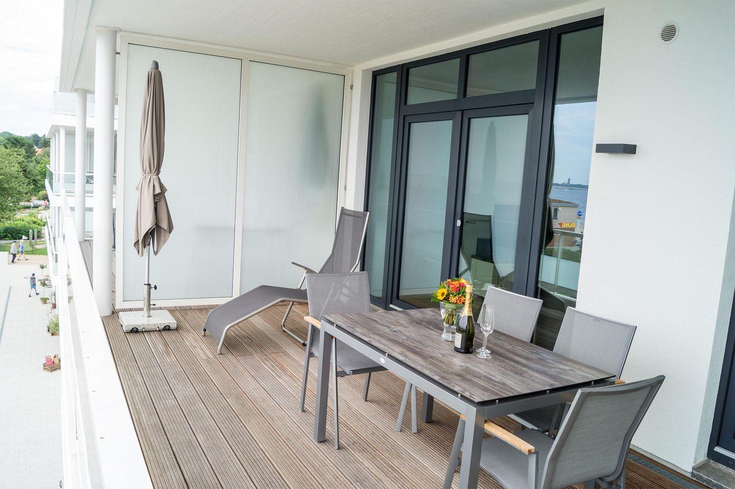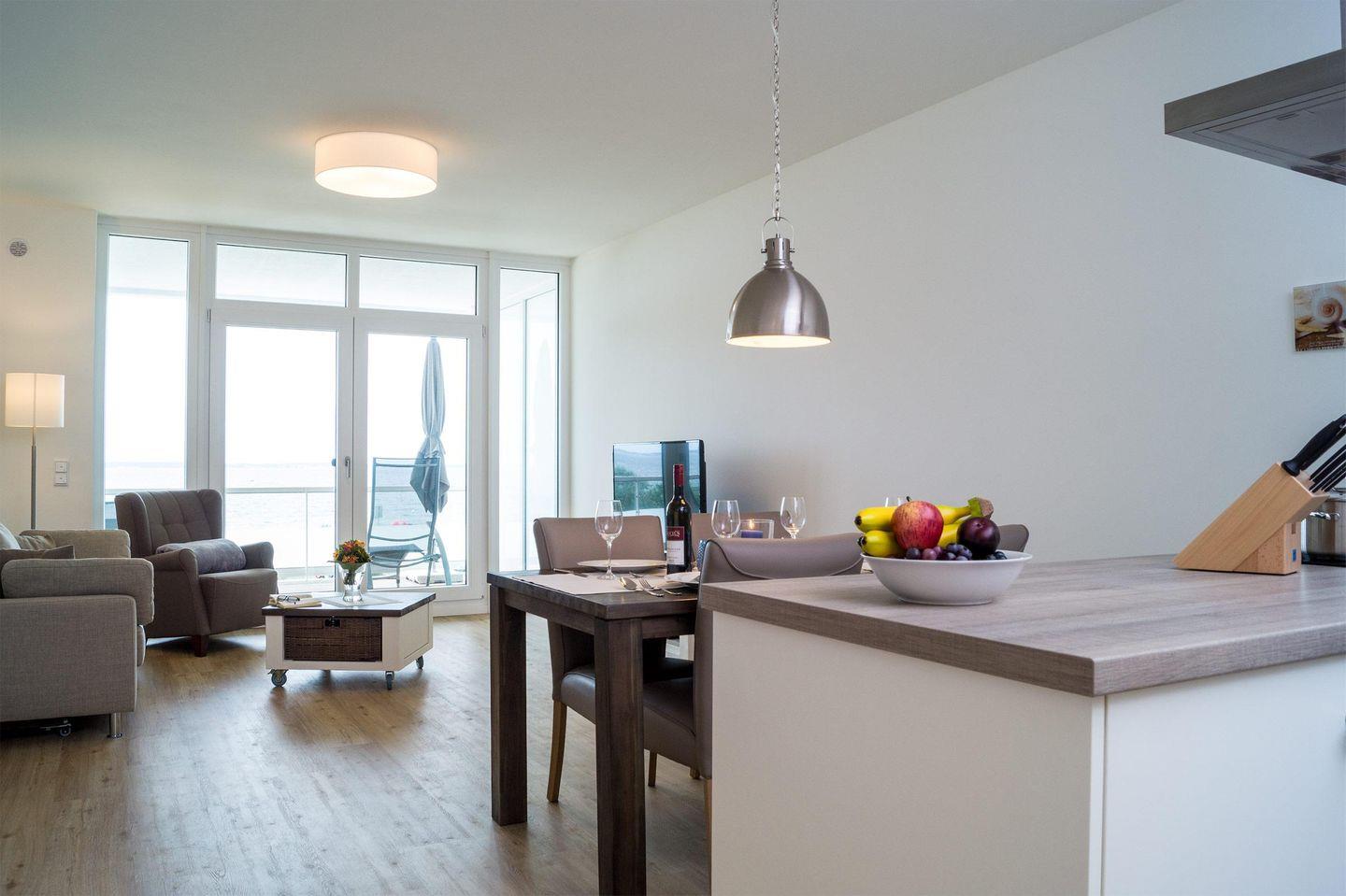 Der helle Flur mit großem Spiegel führt Sie linkerhand in das schöne Badezimmer. Hier erwarten Sie eine Badewanne und eine Dusche, das Urlaubsgefühl stellt sich sofort ein! Zurück auf dem Flur führt Sie ihr Weg direkt in das Herzstück des Apartments, in den Wohnbereich. Eine offene Einbauküche, ein einladender Essbereich sowie eine gemütliche Sofaecke laden zum Verweilen ein! Genießen Sie den Blick aus dem Fenster, denn die Ostsee lacht Ihnen entgegen! Über das Wohnzimmer gelangen Sie in den letzten Raum des Apartments, das Schlafzimmer. Hier stehen ein komfortables Boxspring-Doppelbett, ein geräumiger Kleiderschrank und ein Flachbildfernseher für Sie bereit. Auf den schönen Balkon gelangen Sie sowohl über das Wohnzimmer, als auch über das Schlafzimmer. Zur Ausstattung gehören zwei Sonnenliegen sowie ein Balkontisch mit vier Stühlen. Der frontale Meerblick wird sie begeistern!