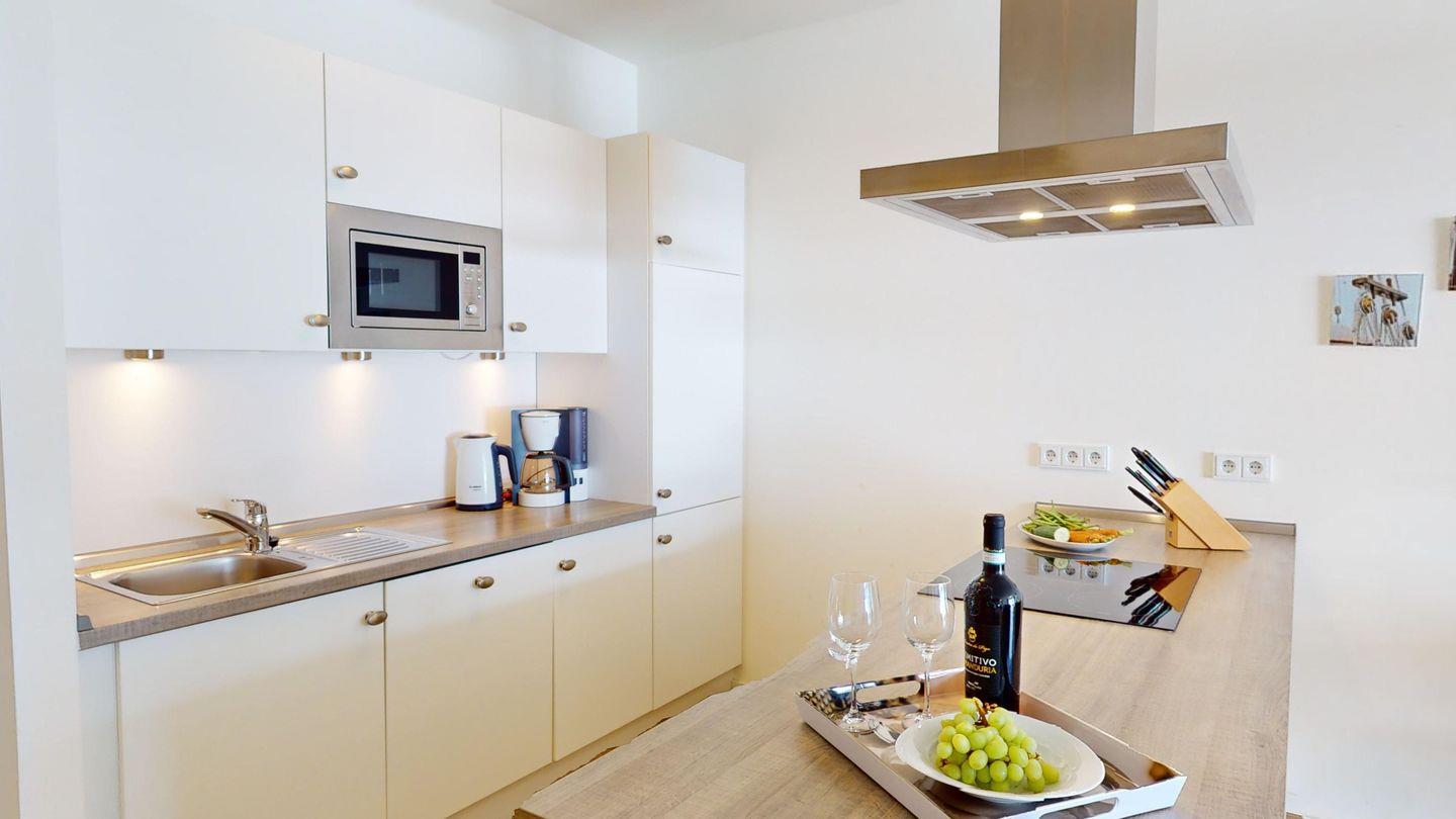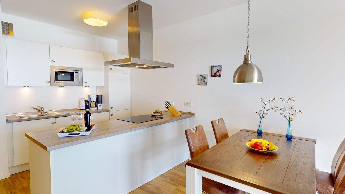 Herzstück der Wohnung ist der helle und offene Wohn- und Essbereich mit offener, voll ausgestatteter Küche. Hier steht auch ein Schlafsofa mit zwei Schlafplätzen.