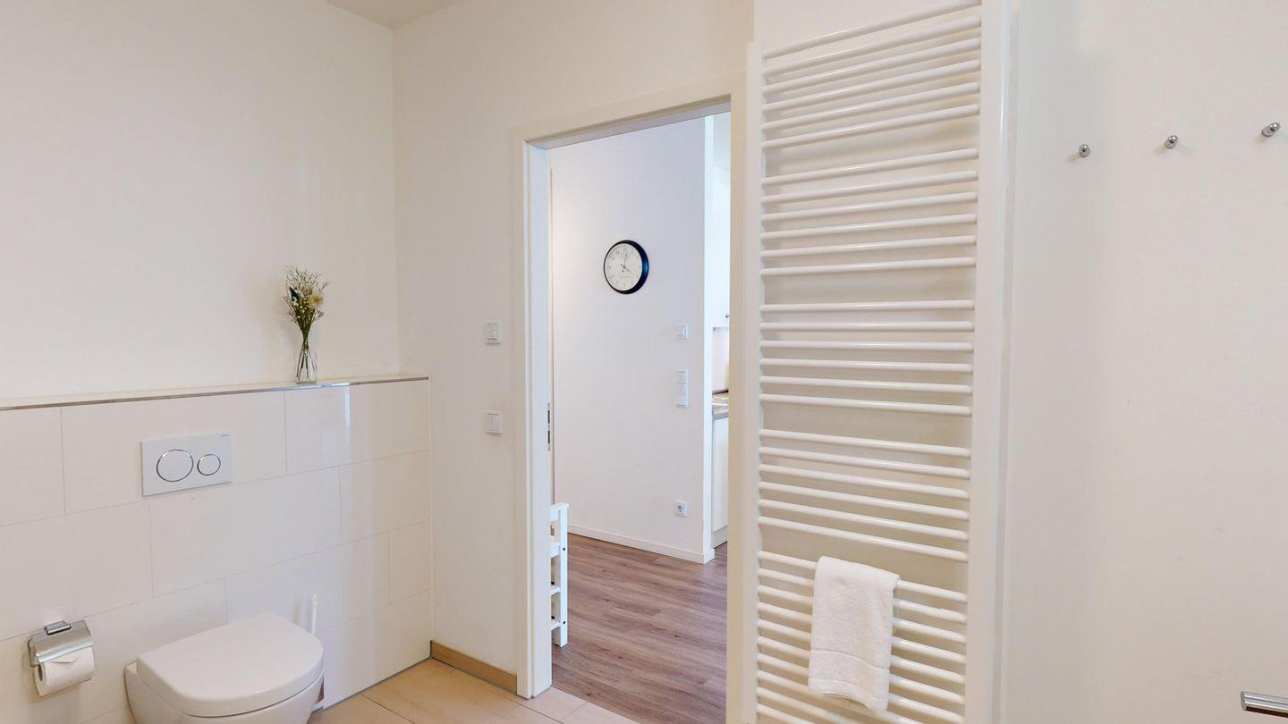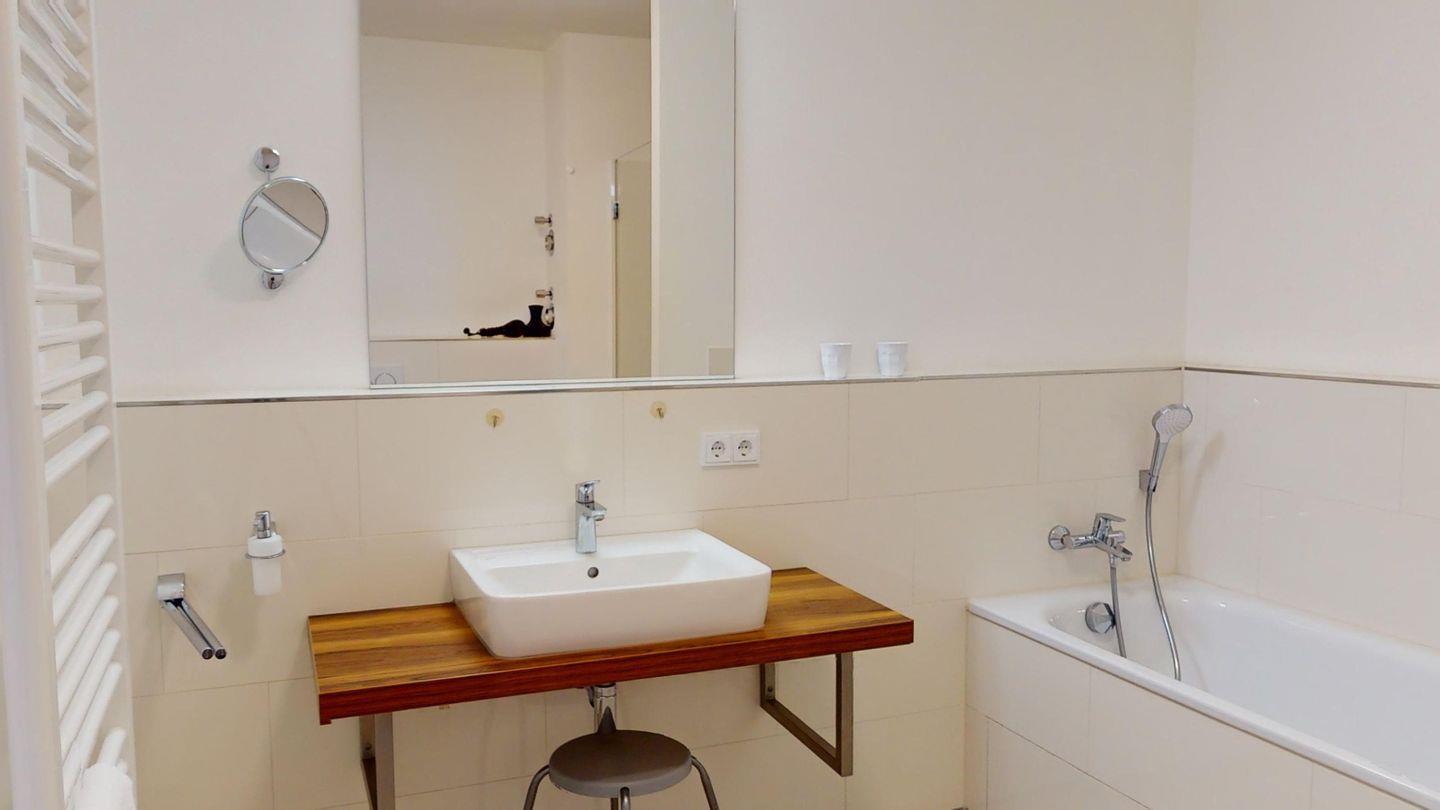 Das separate Schlafzimmer mit gemütlichem Boxspring-Doppelbett verspricht pure Erholung. Ein Bad mit Dusche und Badewanne rundet das Angebot ab.