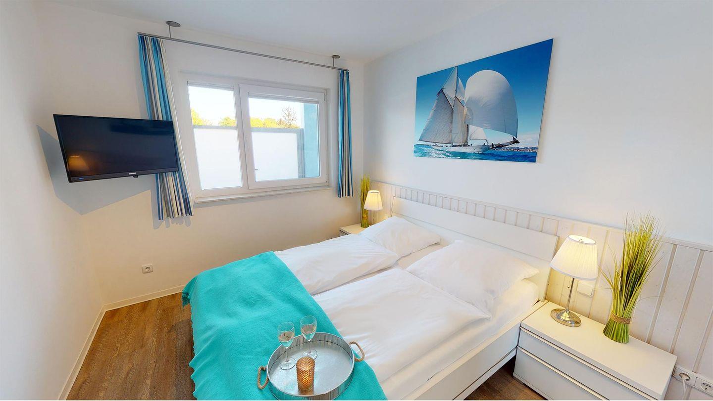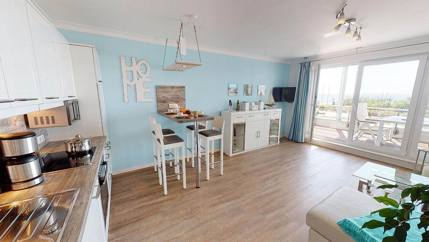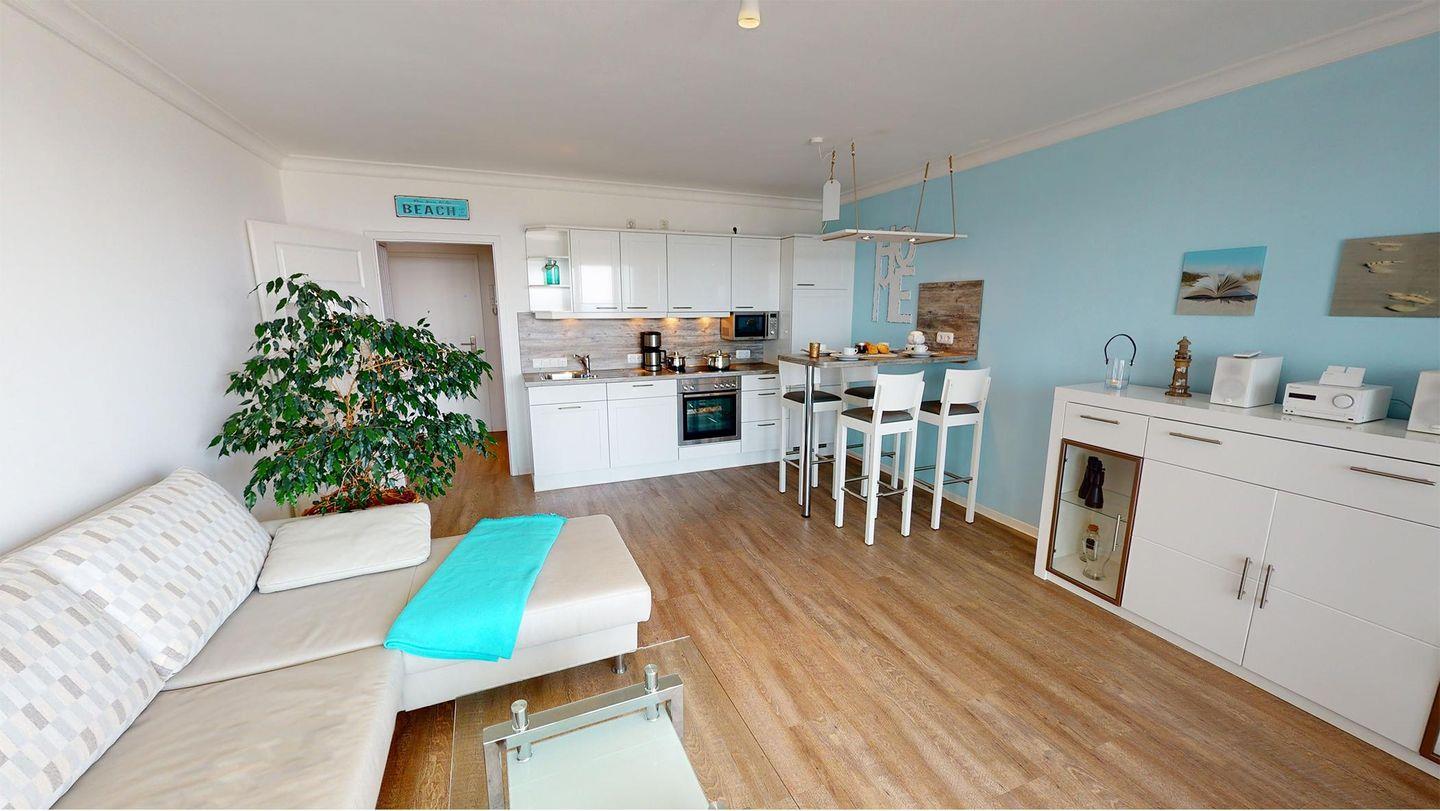 Es gibt ein Schlafzimmer mit Doppelbett sowie ein modernes Bad mit Dusche. Das Herzstück der Wohnung ist der großzügige Wohnbereich mit Sofa, einer erhöhten Essecke sowie einer offenen Küchenzeile – alles mit Meerblick. Das Sofa bietet eine bequeme Schlaffunktion für zwei Personen. Verdunklungsmöglichkeiten im Schlafzimmer und Wohnzimmer sind vorhanden.