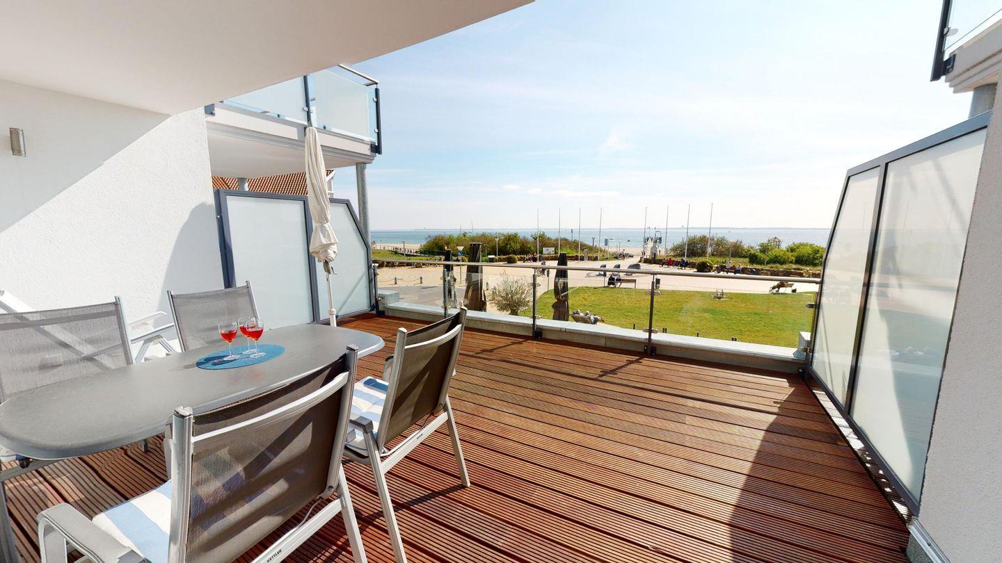 Modernes 53 m²-Ferienapartment für 4 Personen und Hund mit Balkon, Ostseeblick und Privatparkplatz in Pelzerhaken an der Ostsee.