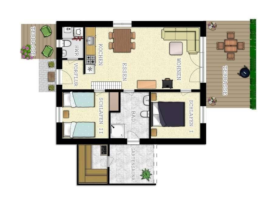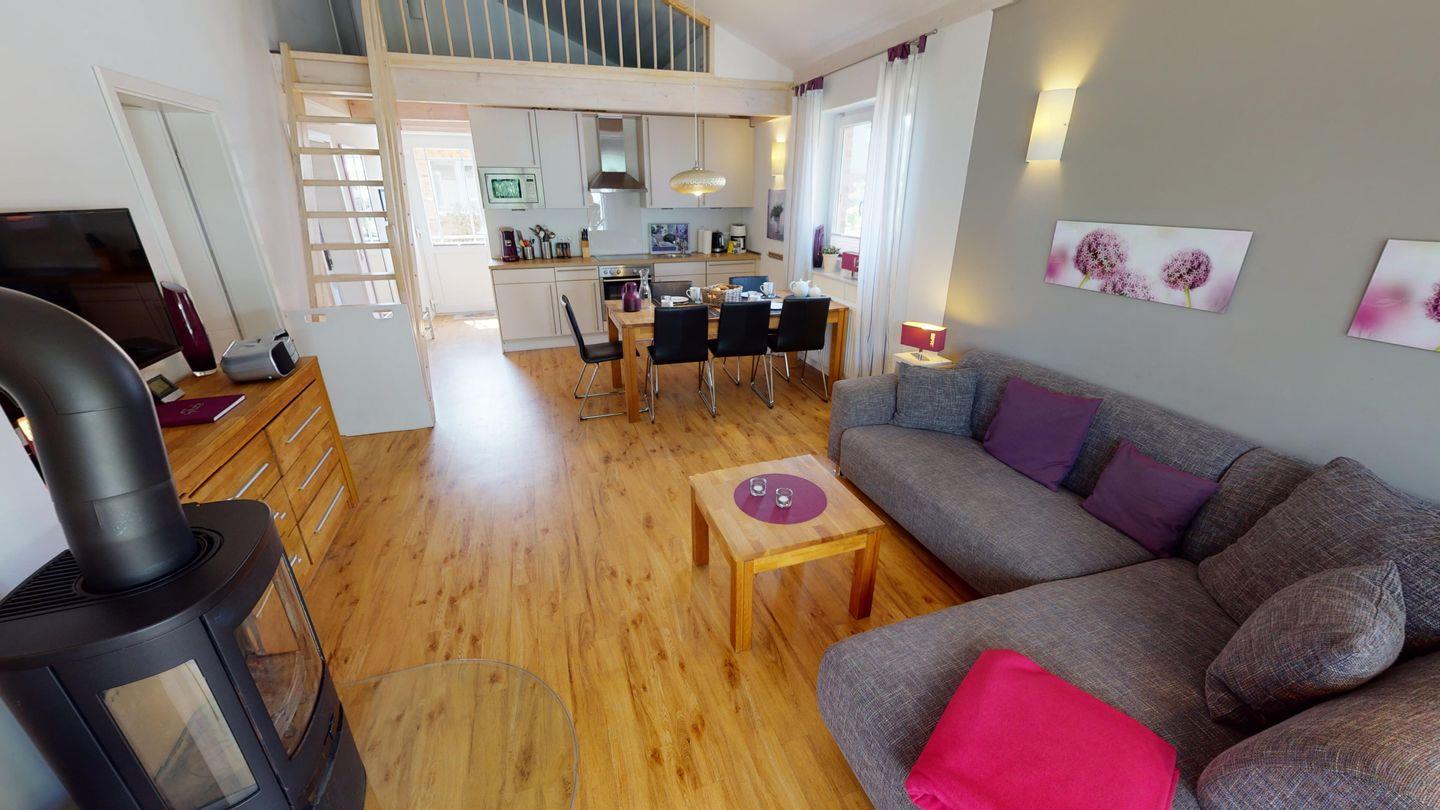 Sie können sich auf einen gemütlichen Wohn-/Essbereich mit Kaminofen sowie eine offene Küchenzeile freuen. Es gibt zwei schöne Schlafzimmer (eins mit Doppelbett, eins mit zwei Einzelbetten) sowie ein Doppelbett auf dem Schlafboden, der speziell für Kinder ausgelegt ist. Die Treppe zum Schlafboden ist mit einem Kletterschutz gesichert. Insgesamt verfügt das Haus über zwei Bäder - ein großes, barrierefreies Duschbad mit Durchgang zur Outdoor-Sauna und ein Gäste-WC.