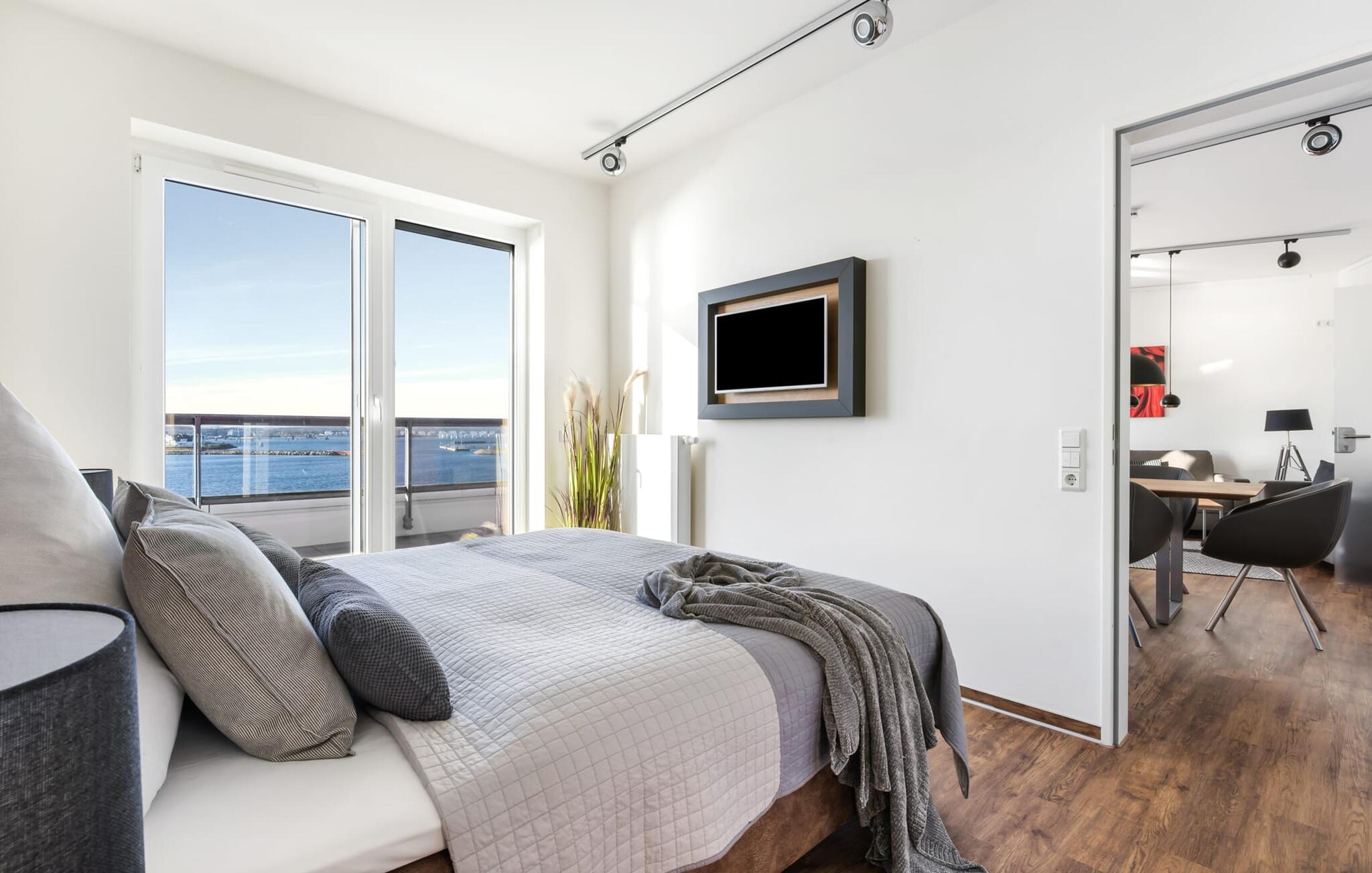 Højdepunktet ved HOCHGENUSS er den omkringliggende U-formede tagterrasse, som byder på en overvældende udsigt over Østersøens vidder, Sleien og havneindløbet. Mere hav er ikke muligt!
