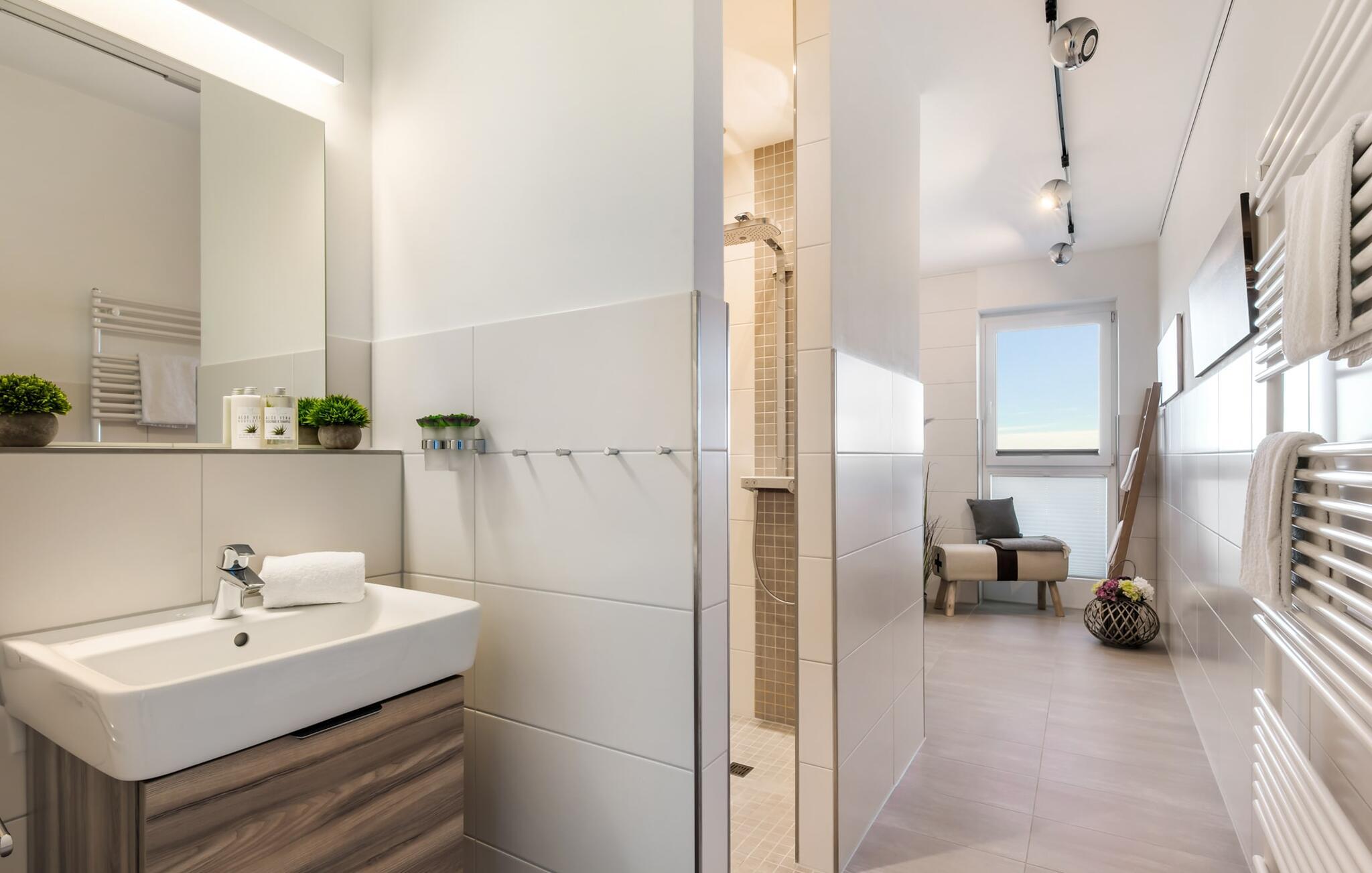 Et andet elegant badeværelse forkæler dig også med en stor bruseniche, som er i niveau med gulvet og sikrer en afslappet start på hver dag.