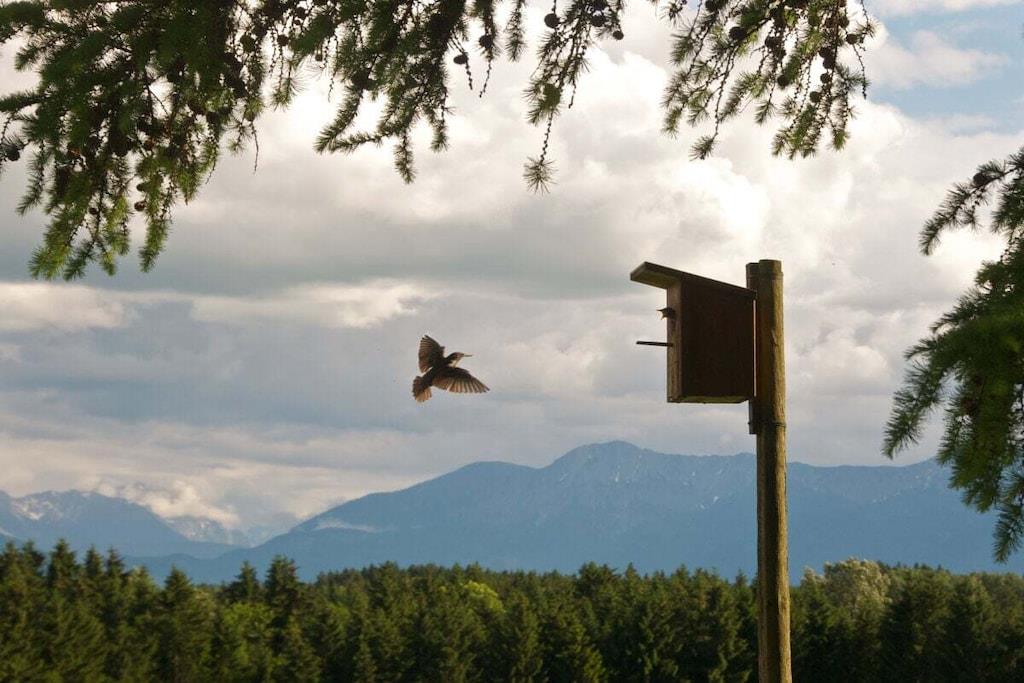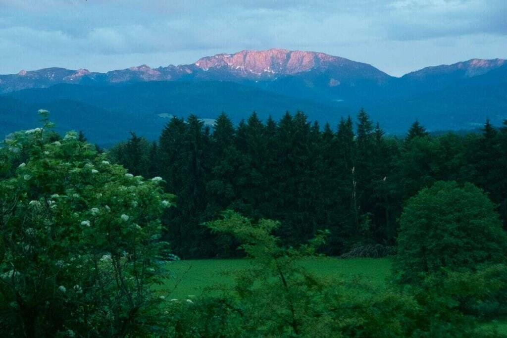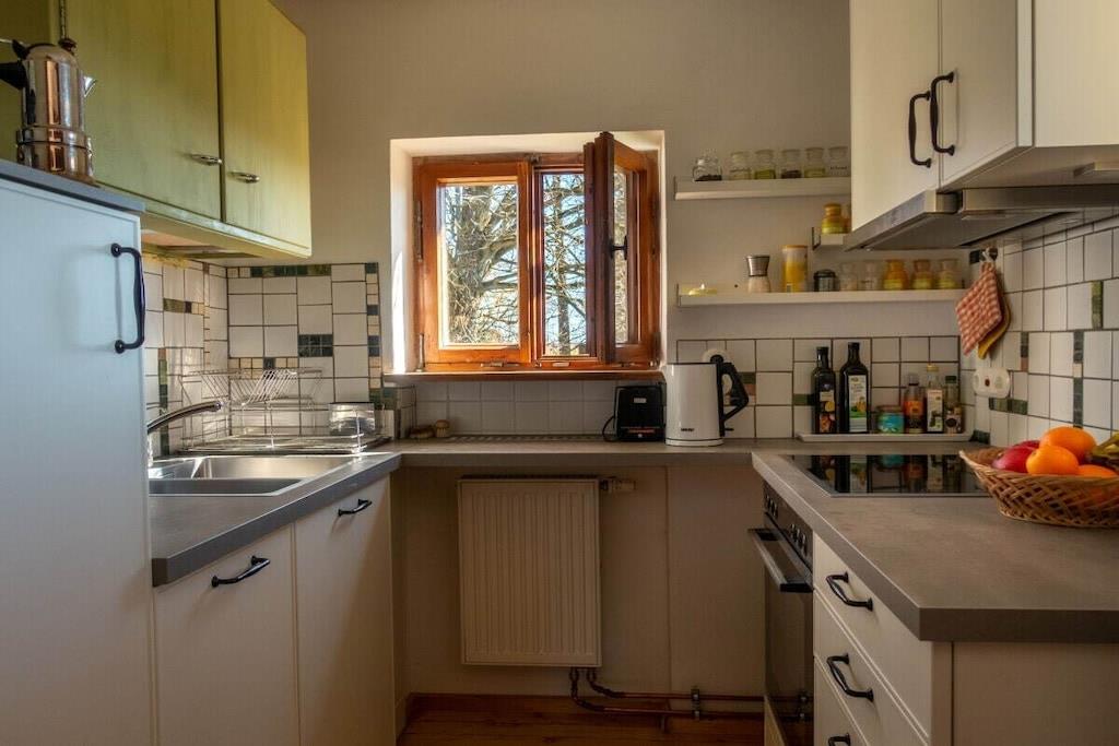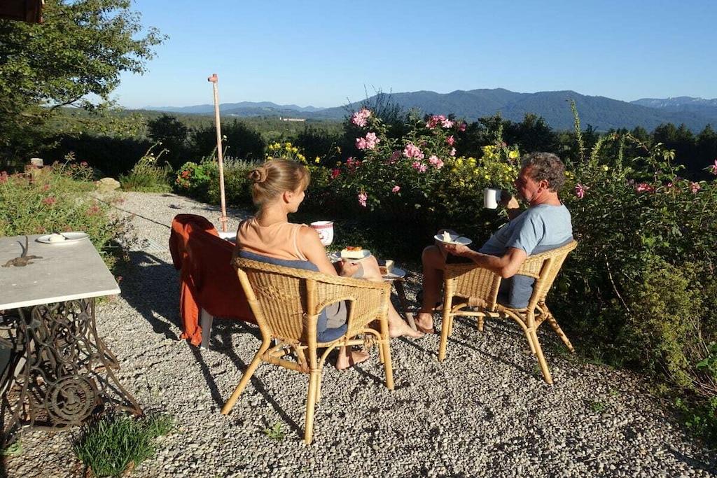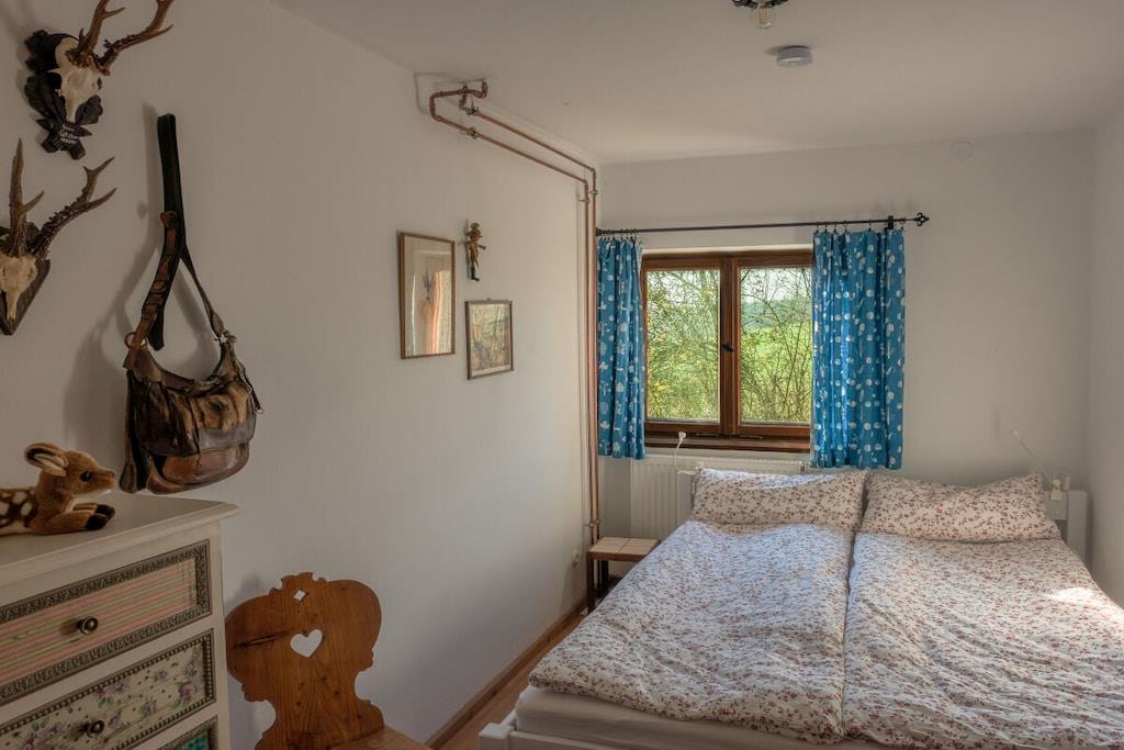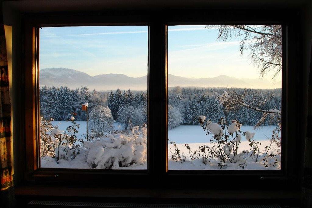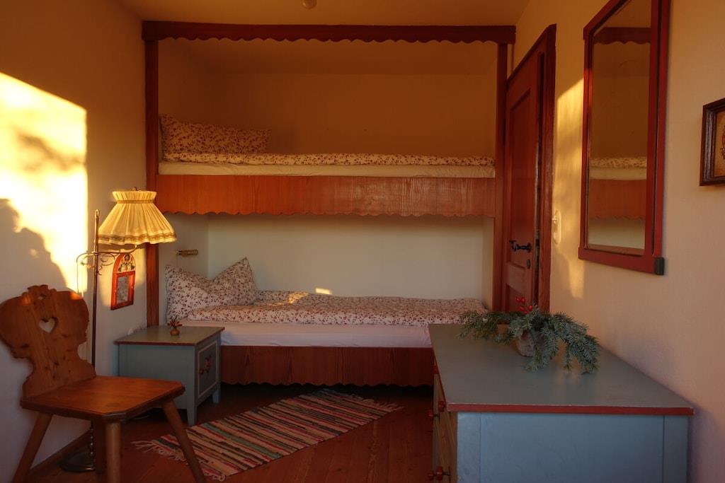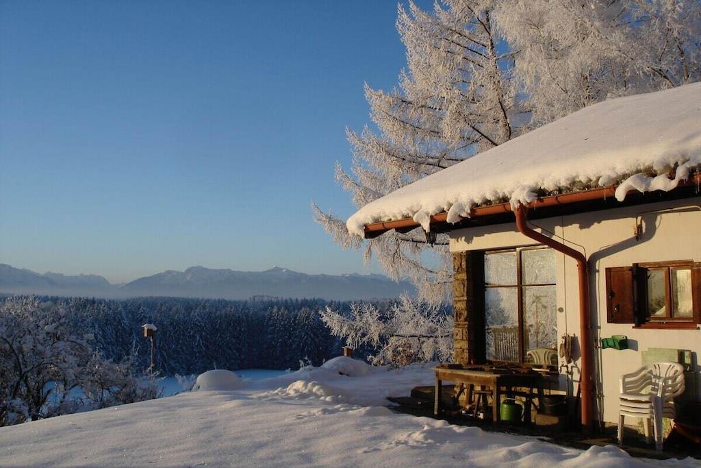 A cozy, stylish country house, with a fantastic mountain view of the nearby Alps and a natural garden - a wonderful place to slow down. Particularly suitable for children! The former hunting lodge is the grandparents' heirloom, which we have lovingly renovated. It is located on the edge of the village on a hill near Penzberg, about 45 minutes by car south of Munich. The sunny, wind-protected terrace can even be enjoyed in winter. All rooms are on the ground floor: 3 bedrooms; 1 cozy living room; new, fully equipped kitchen; bathroom with tub; toilet. (The upper floor is not occupied.) Sleeping space for about 7 people: Double bed 180x200 in the 'bell room'. Double bed 160x200 in the front (through) room. Bunk bed 100x200 in the back room. Sofa bed in the living room. In addition, the renovated children's hut in the garden offers a 2x2m bedroom and a playroom with a table. The large, natural and fenced garden with old trees invites you to relax and play. A swimming pond is 3 km away.