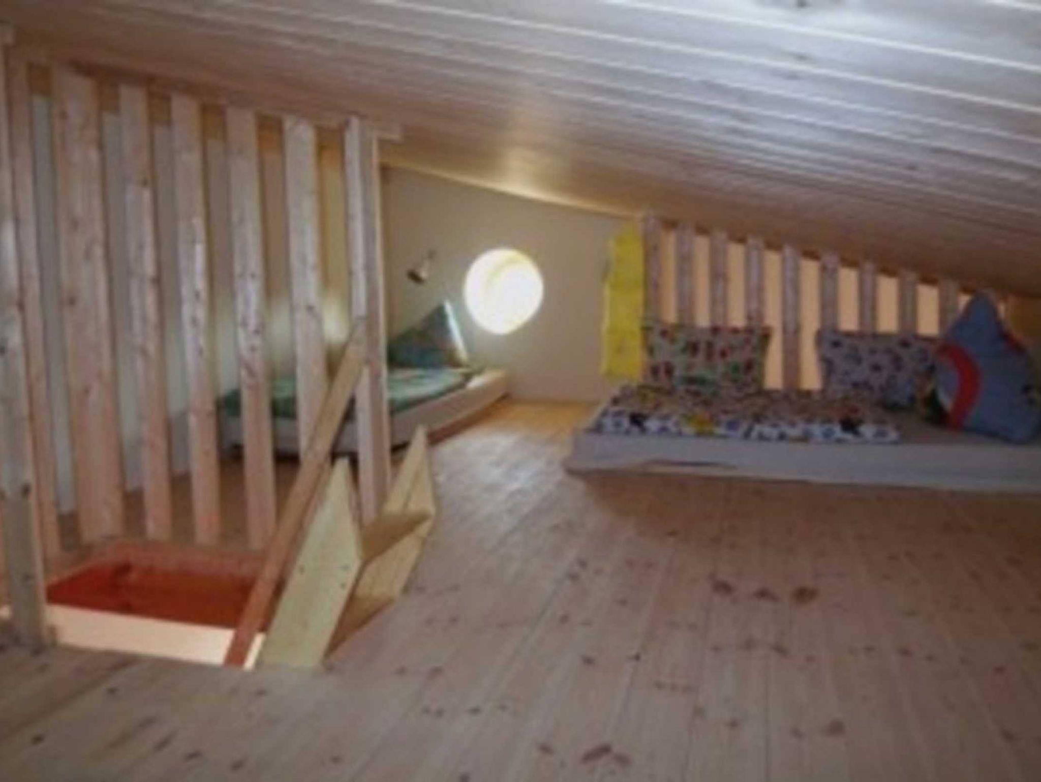 Über eine schmale Zimmertreppe gelangen Sie in den oberen Schlafbereich für die Kinder. Zwei Lattenroste (2,0m x 0,90m) mit Bettmatratze bilden die Schlafstatt. Leselampe und ein Hängenetz für die wichtigen Kleinigkeiten machen es zu einem kuschligen Nest mit rundem Fenster und einem sagenhaften Blick über den gesamten Hof, die Tiere...