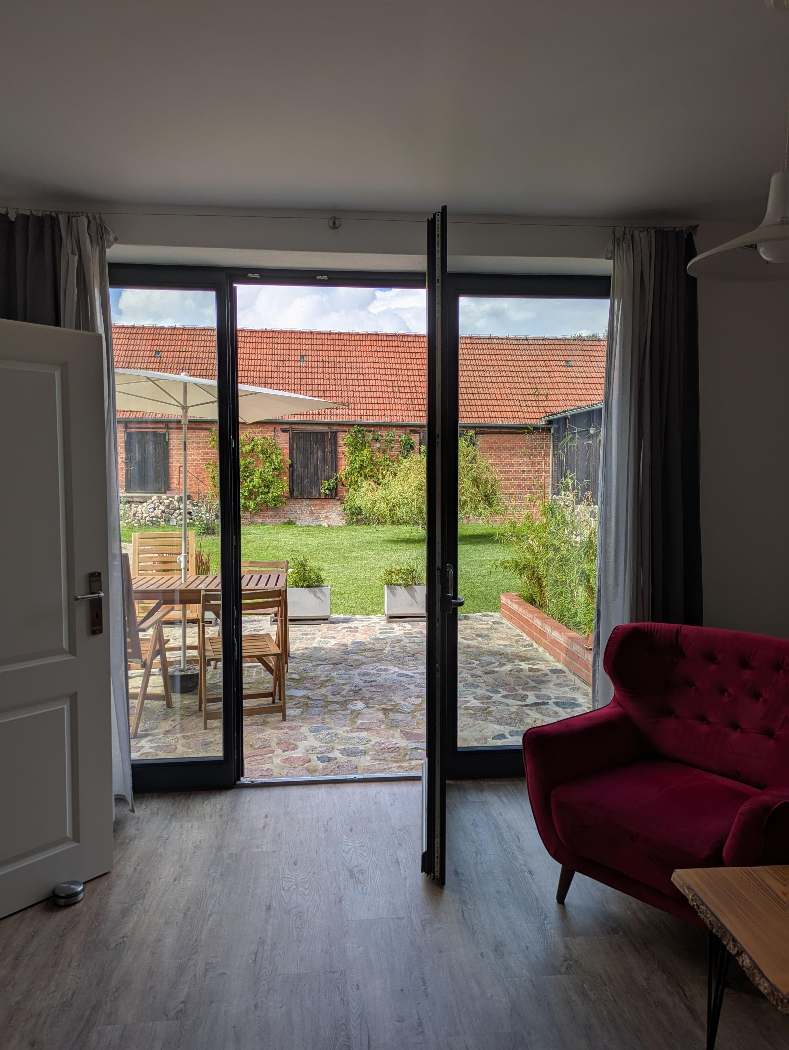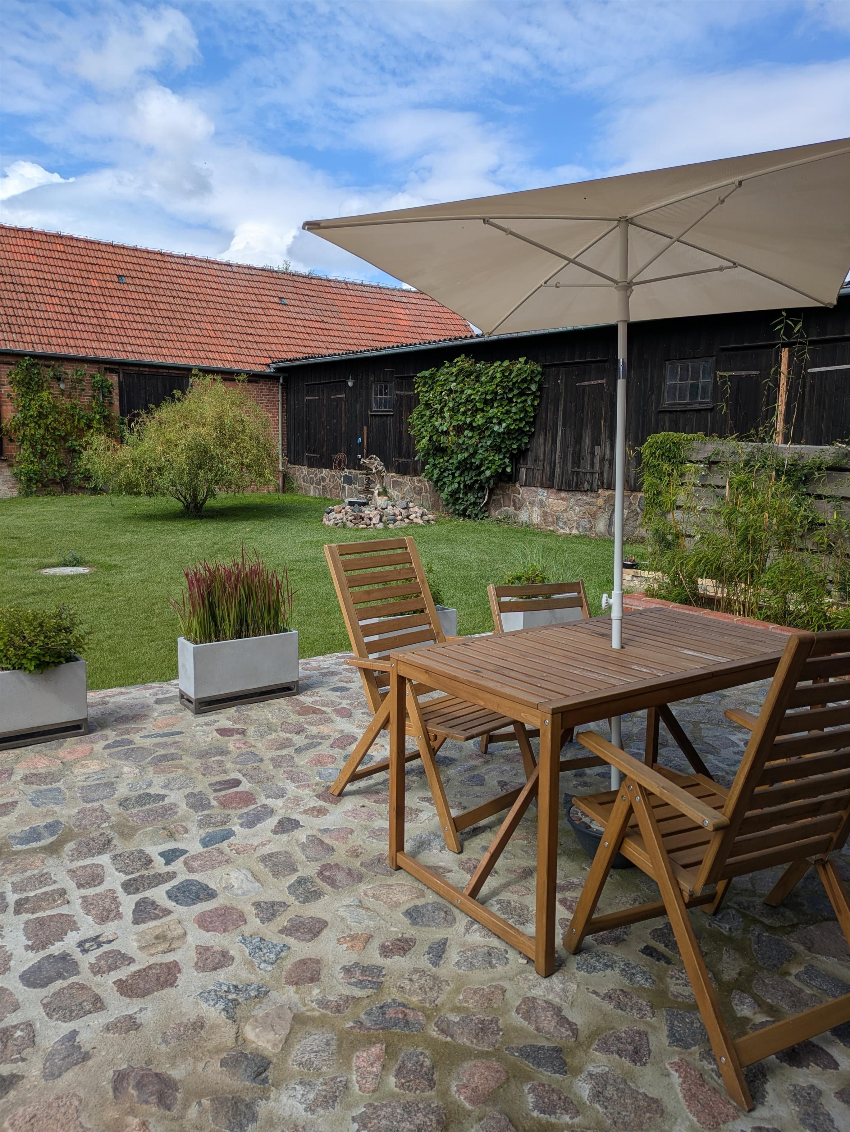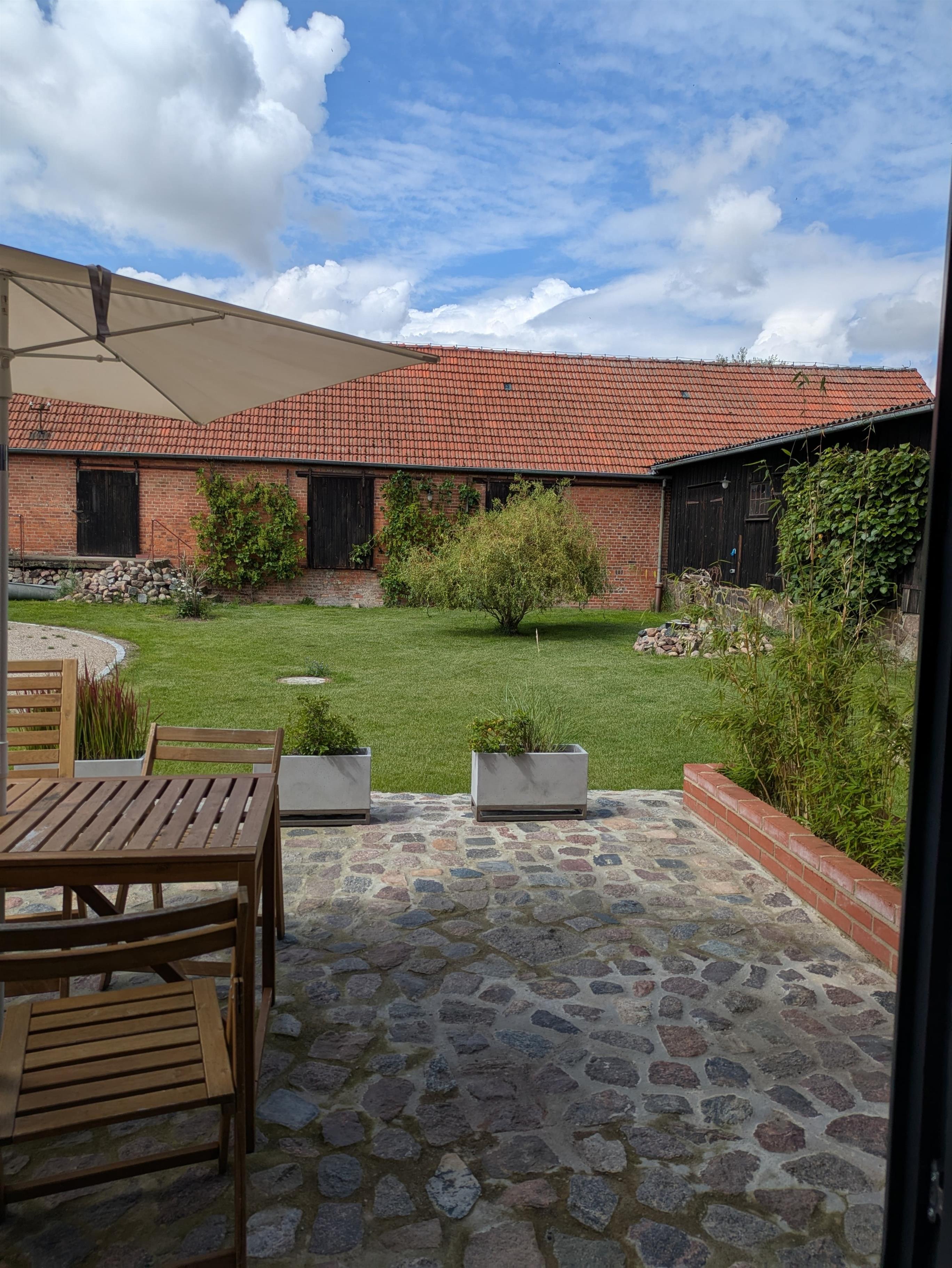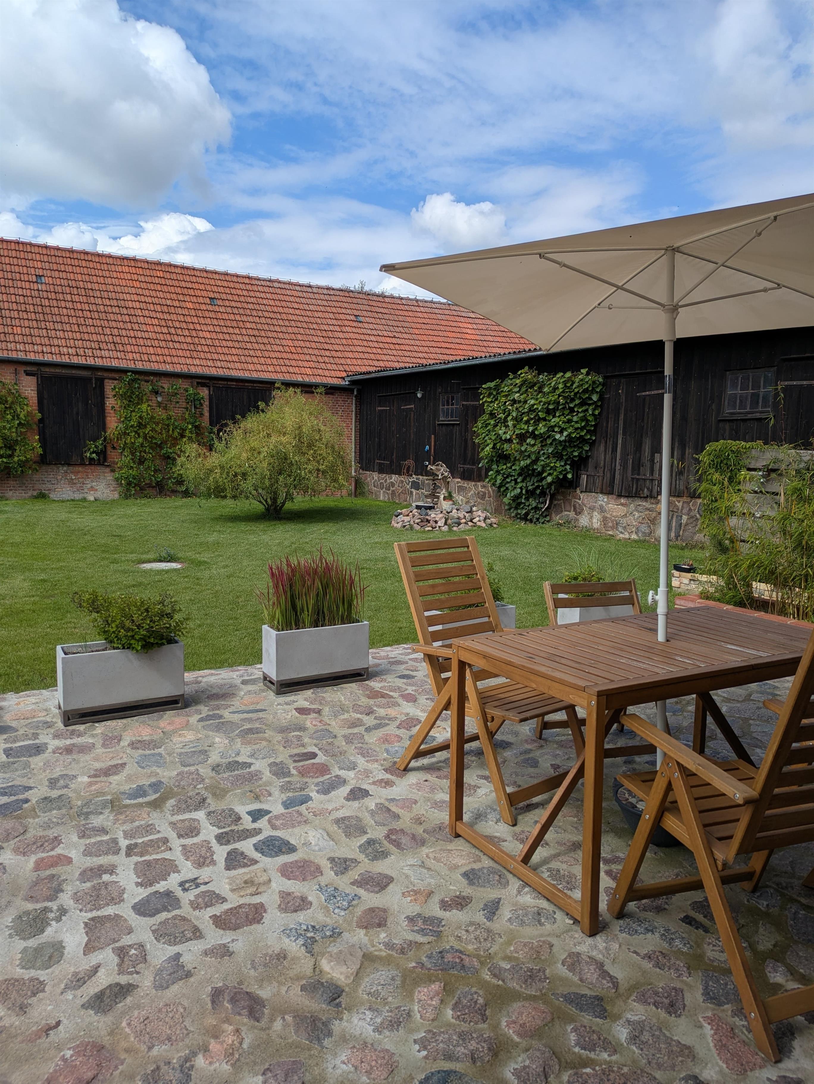 Die Ferienwohnung befindet sich in einem historischen, behutsam sanierten Baudenkmal, das in Fachwerk und Backstein als Getreidespeicher errichtet wurde. Das Haus liegt eingebettet in eine großzügige Garten-, Hof- und Wiesenlandschaft und ist durch die "U-Form" seines Grundrisses schallgeschützt vor Verkehrslärm. Auf der großen Natursteinterrasse können die Gäste vom Frühstück bis zum Sonnenuntergang auf gemütlichem Mobiliar die Natur und die Sonne genießen.