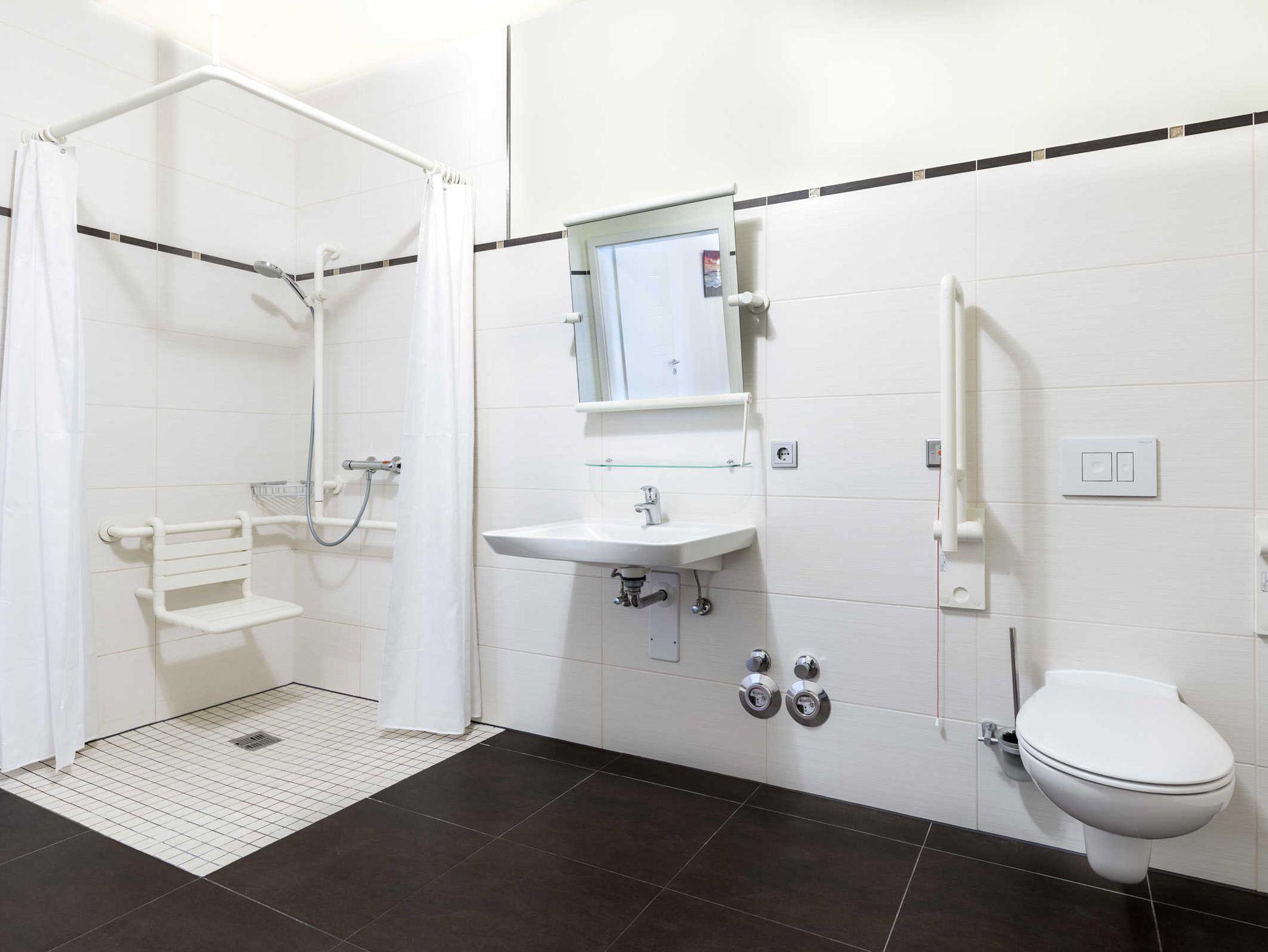 Die Ferienwohnung Barbara ist ganz und gar rollstuhlgrecht eingerichtet und bietet somit auch ein perfektes Feriendomizil für Rollifahrer. Die Ferienwohnung verfügt über zwei separate Schlafzimmer je mit Doppelbett und Kleiderschrank sowie einen komfortablen Wohn- und Essbereich mit unterfahrbarer Küchenzeile (Kühlschrank, Gefrierfach, Kaffeemaschine, Toaster, Wasserkocher). Der Esstisch sowie die Sitzecke mit bequemer Schlafcouch bieten ausreichend Platz zum Wohlfühlen. Aus dem Wohnzimmer gelangen Sie direkt auf die Holzterrasse mit dem Blick auf die Ferienanlage und in die grüne Salzhafflandschaft. Das Bad mit Dusche und WC ist barriefrei gestaltet.
