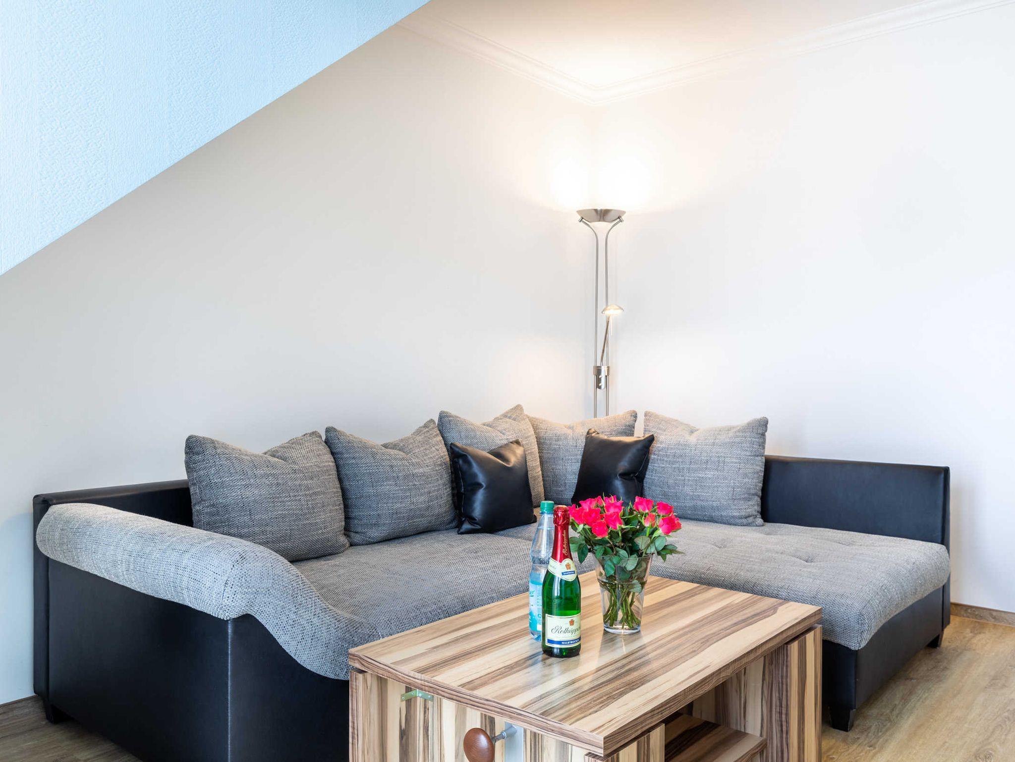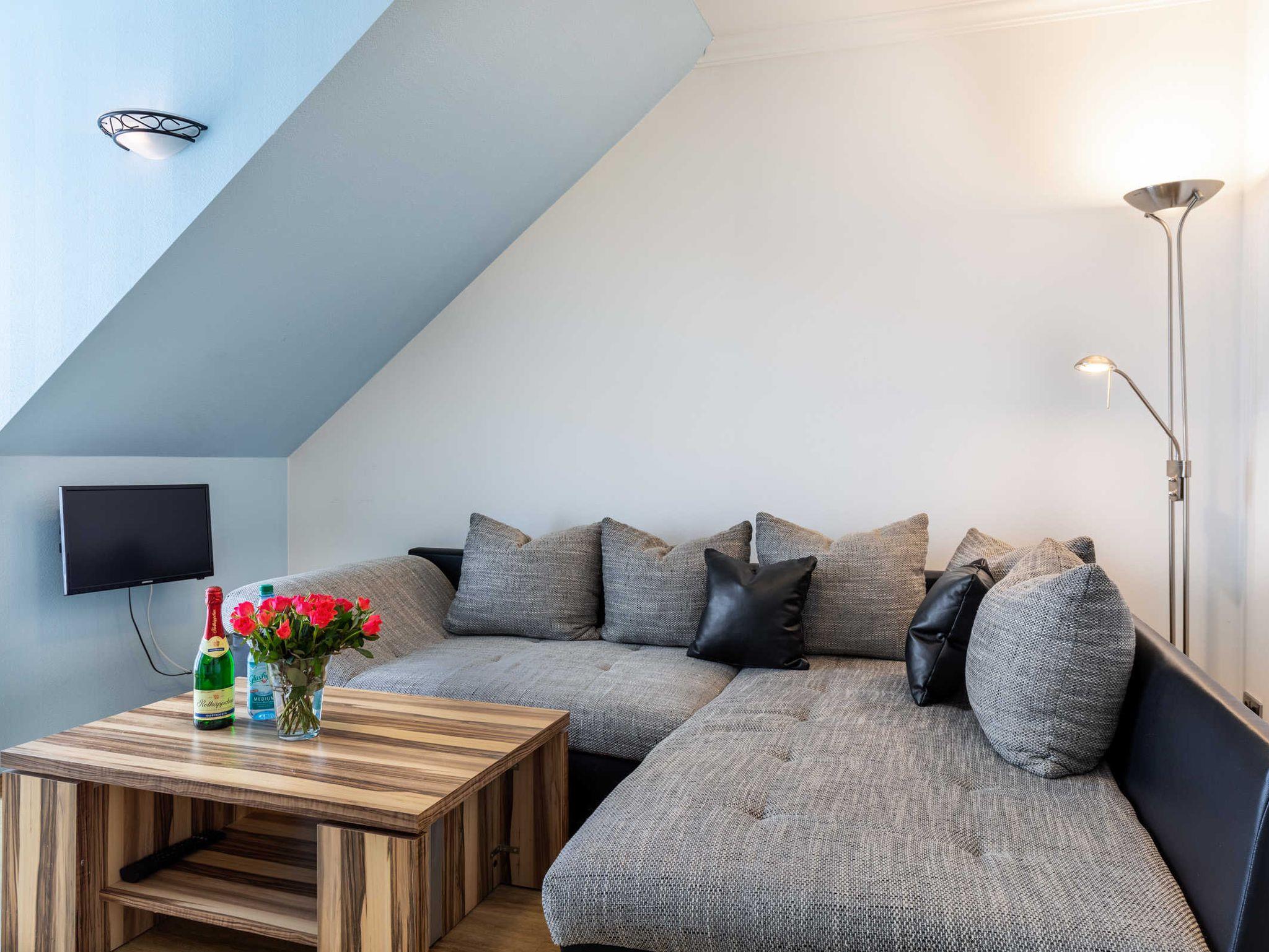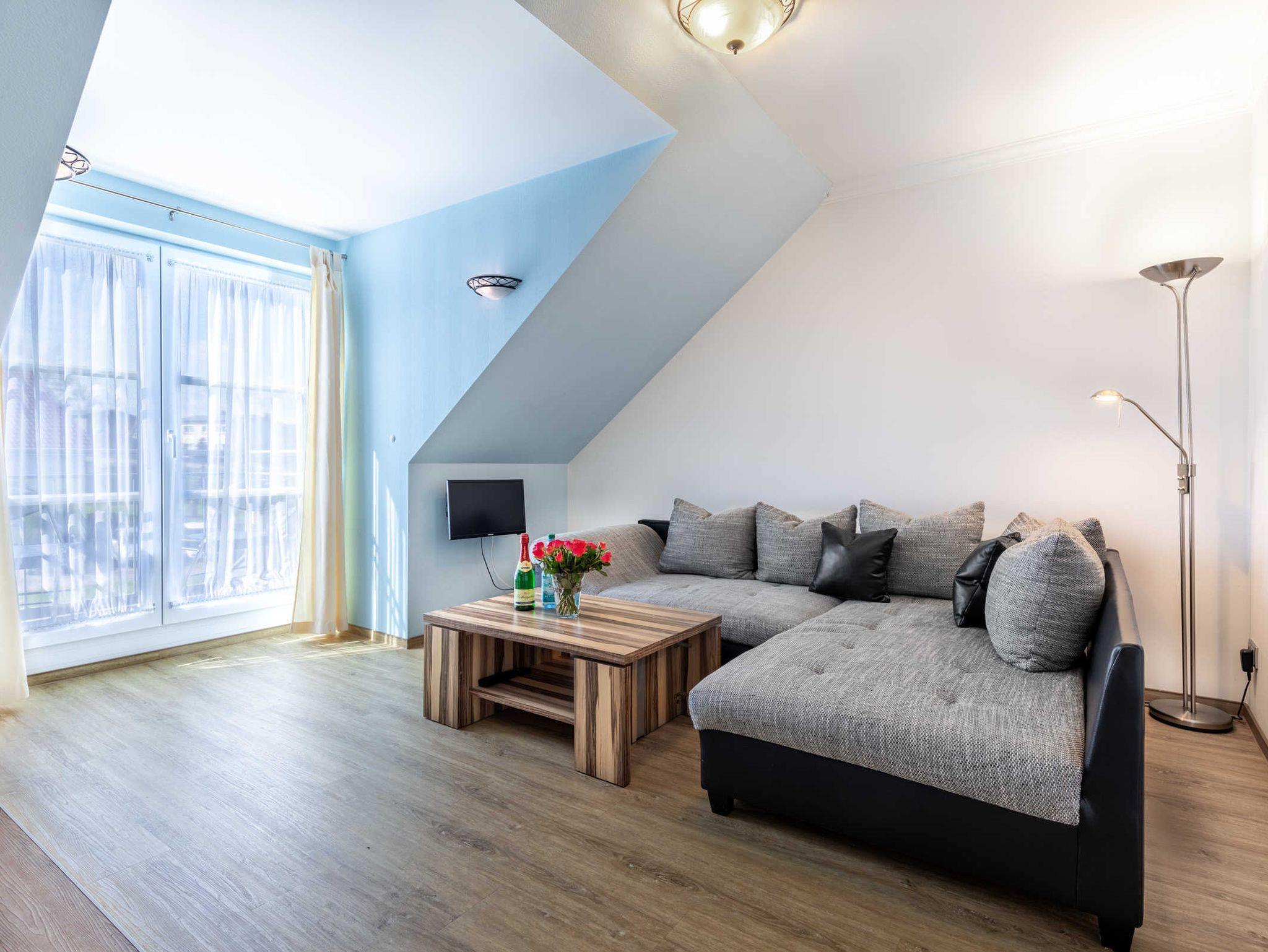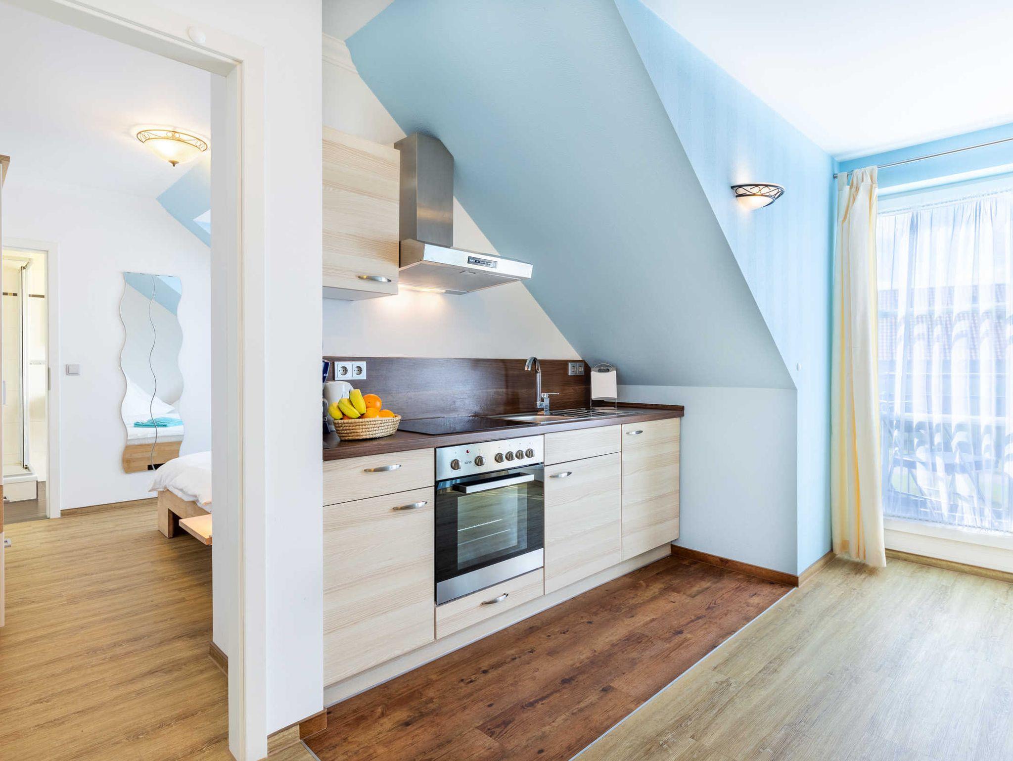 Die helle und gemütliche Ferienwohnung Lisa befindet sich im Obergeschoss des Ostseeferienhauses Drachenflieger. Die Ferienwohnung verfügt über ein separtes Schlafzimmer mit Doppelbett und Kleiderschrank, einen Wohn- Essbereich mit umfangreich ausgestatteter Küchenzeile (Kühlschrank mit Gefrierfach, 4- Platten- Herd, Backofen, Kaffeemaschine, Wasserkocher, Toaster) sowie einen Essbereich und Sitzecke mit ausziehbarer bequemer Schlafcouch. Vom Wohnbereich gelangen Sie auf den Balkon/Loggia. Bad mit Dusche und WC.