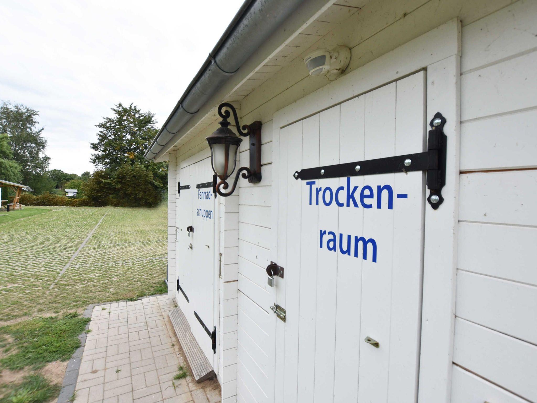 Abschließbarer Fahrradschuppen, Unterstellmöglichkeit sowie Wasch- und Trockenplatz für Wassersportzubehör, wie Surfbretter, Neos oder Tauchausrüstung.