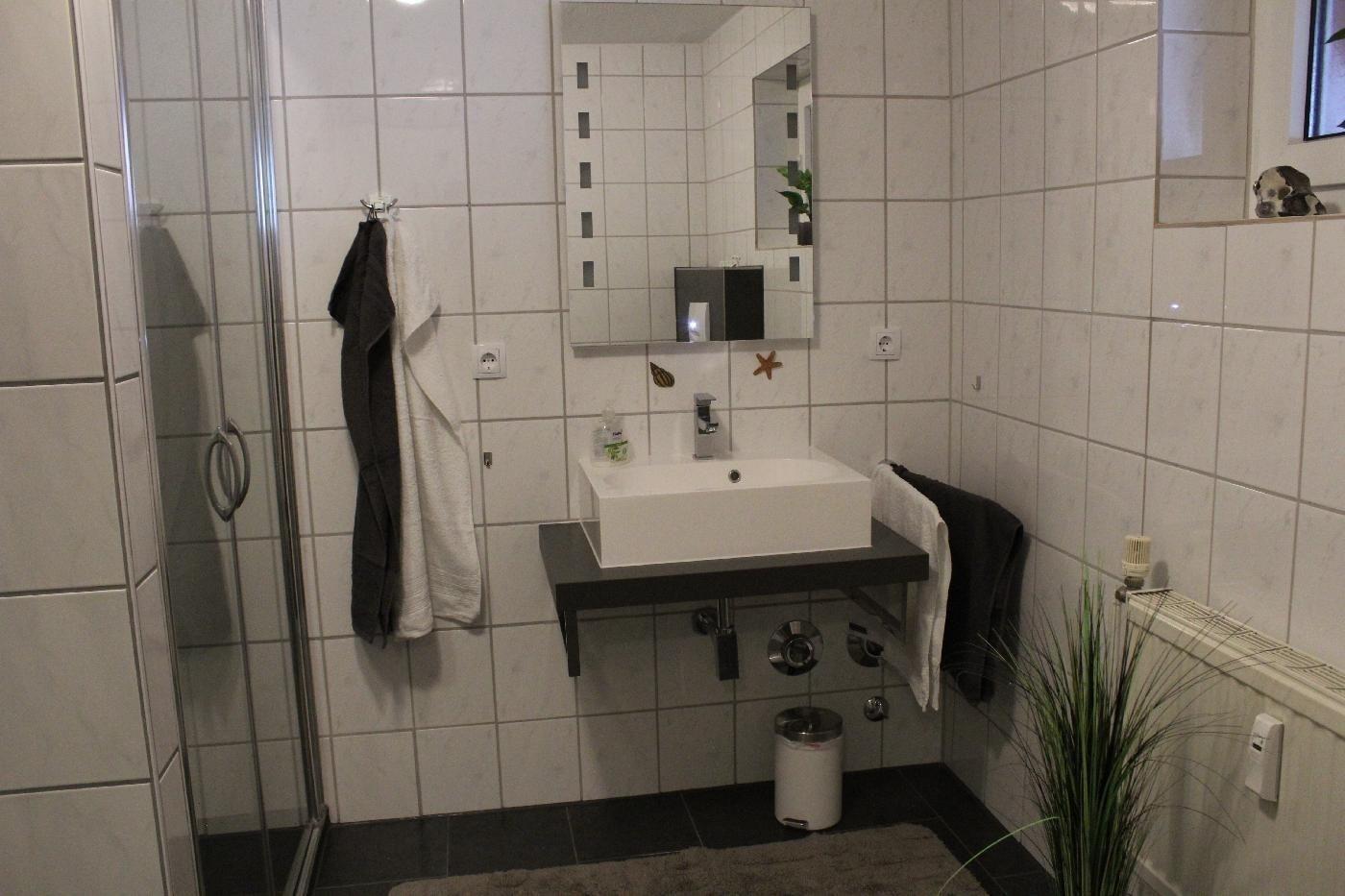 Das moderne Bad ist barrierefrei und verfügt über eine Waschmaschine.