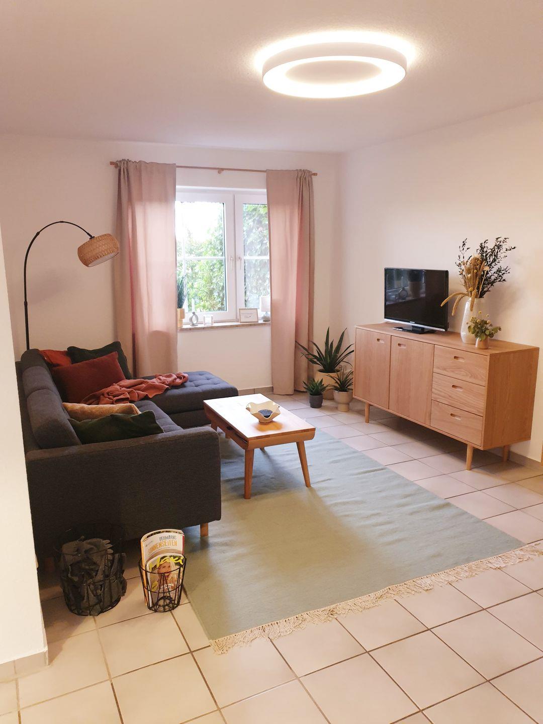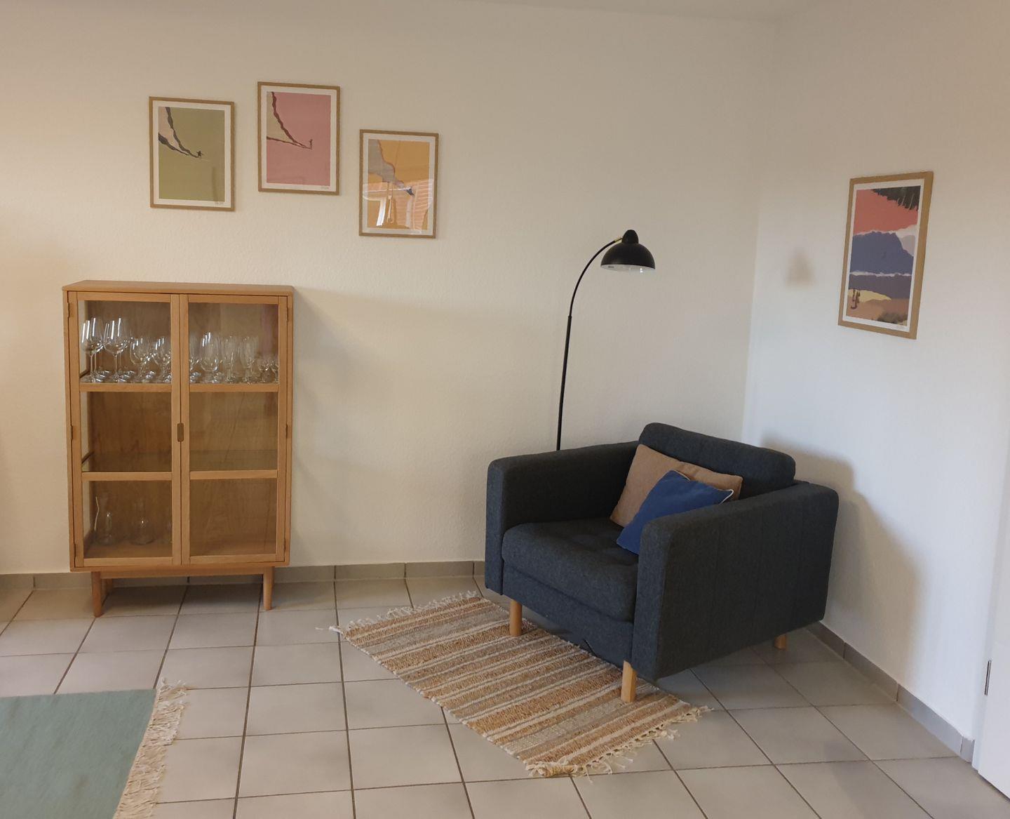 Ferienwohnung im Erdgeschoss mit Terrasse und Blick auf die Felder, Größe ca. 56 m2 Wohn-Esszimmer ca. 25 m2, gemütliche große Sofaecke, Sessel, Farb-TV-SAT im Wohnzimmer, offene Küche mit Einbauküche, Induktionskochfeld, Backofen, Kühlschrank mit Gefrierfach, Geschirrspüler, Essplatz für 4 Personen, Terrasse mit Gartenmöbeln, Duschbad mit Waschmaschine, Föhn, Schlafzimmer mit Doppelbett, Schwebetürenschrank und Kommode.