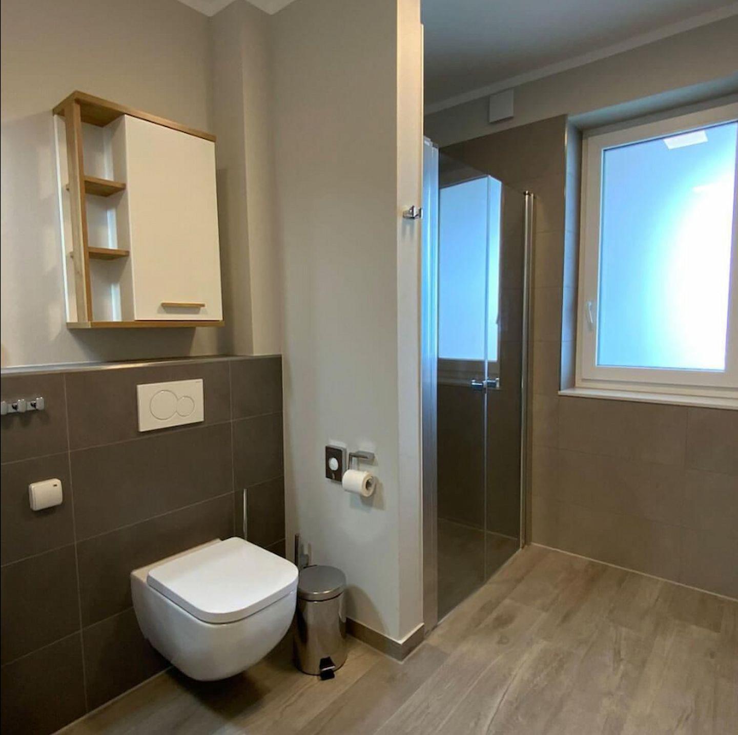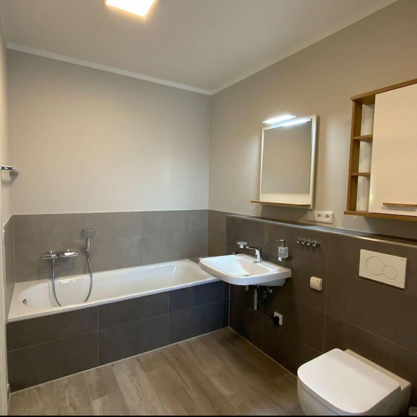 Das Bad besitzt eine ebenerdige Dusche sowie eine Badewanne. Eine Waschmaschine und ein Wäscheständer sind ebenfalls vorhanden.