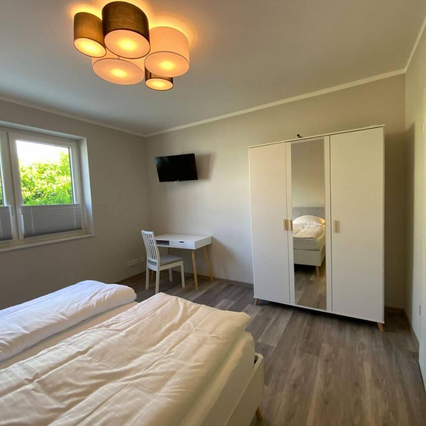 Alle 4 Betten sind mit hochwertigen Matratzen ausgestattet, welche eine weiche und eine härtere Seite haben. Das Hauptschlafzimmer verfügt über ein Doppelbett, einen Frisiertisch und einen 32" Smart TV. Im zweiten Schlafzimmer befindet sich ebenfalls ein 32" Smart TV, 2 Einzelbetten sowie ein Schreibtisch.