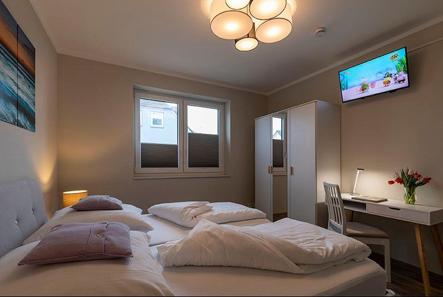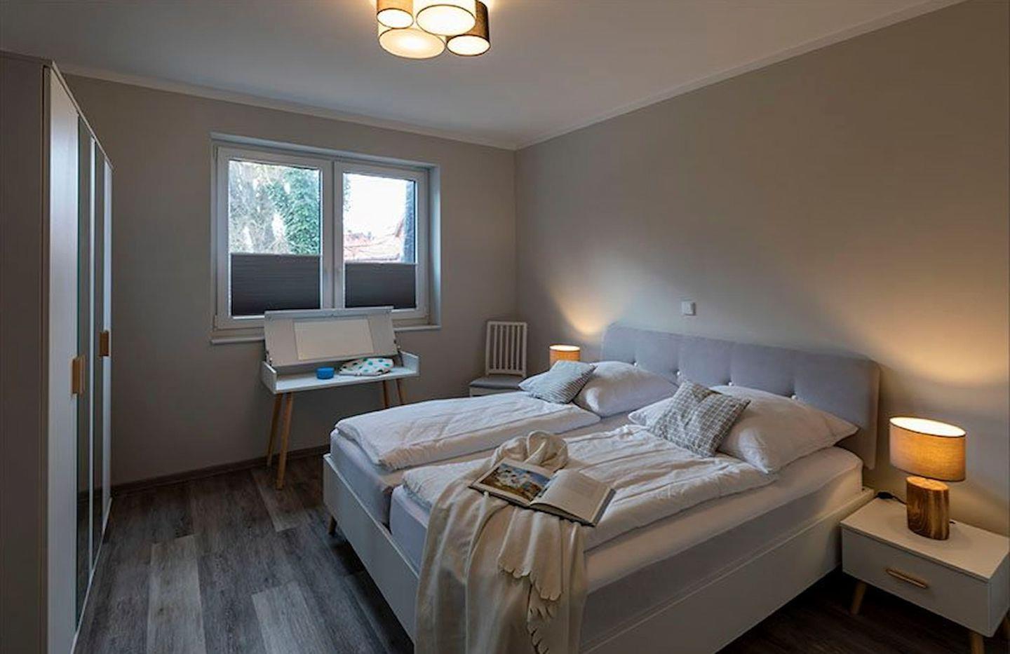 Alle 4 Betten sind mit hochwertigen Matratzen ausgestattet, welche eine weiche und eine härtere Seite haben. Das Hauptschlafzimmer verfügt über ein Doppelbett, einen Frisiertisch und einen 32" Smart TV. Im zweiten Schlafzimmer befindet sich ebenfalls ein Smart TV, 2 Einzelbetten sowie ein Schreibtisch.