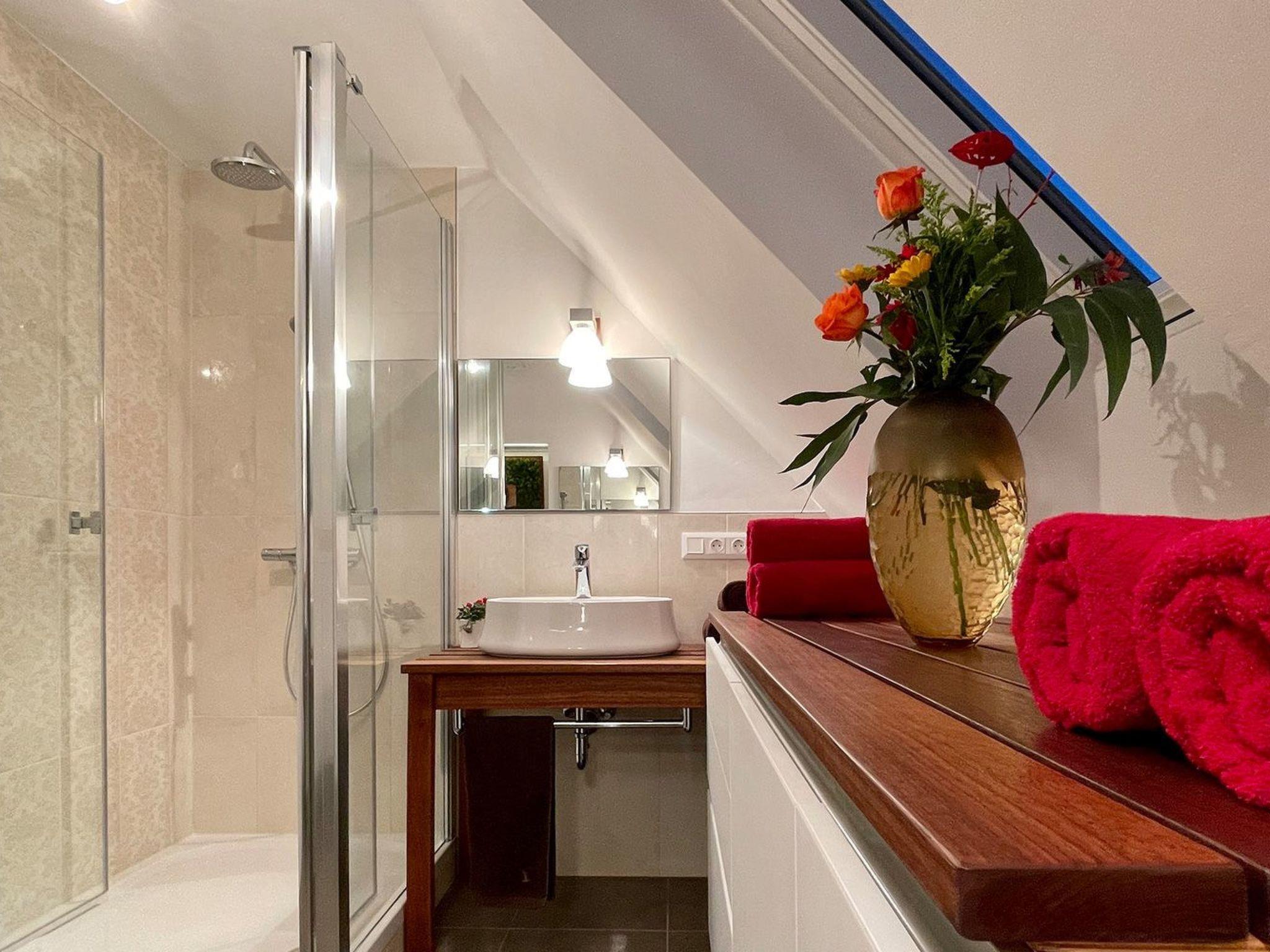 Bathroom: Real glass shower cubicle with low entry, rain shower and hand shower.