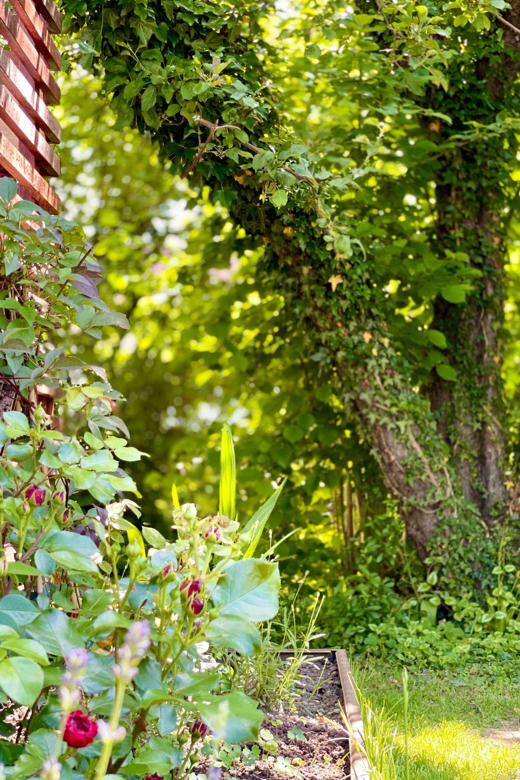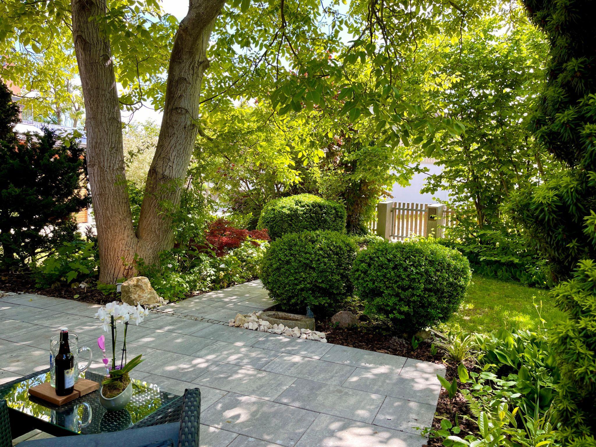 approx. 400 sqm private garden, completely fenced except for the open driveway, three car parking spaces, beautifully ingrown garden with mature trees