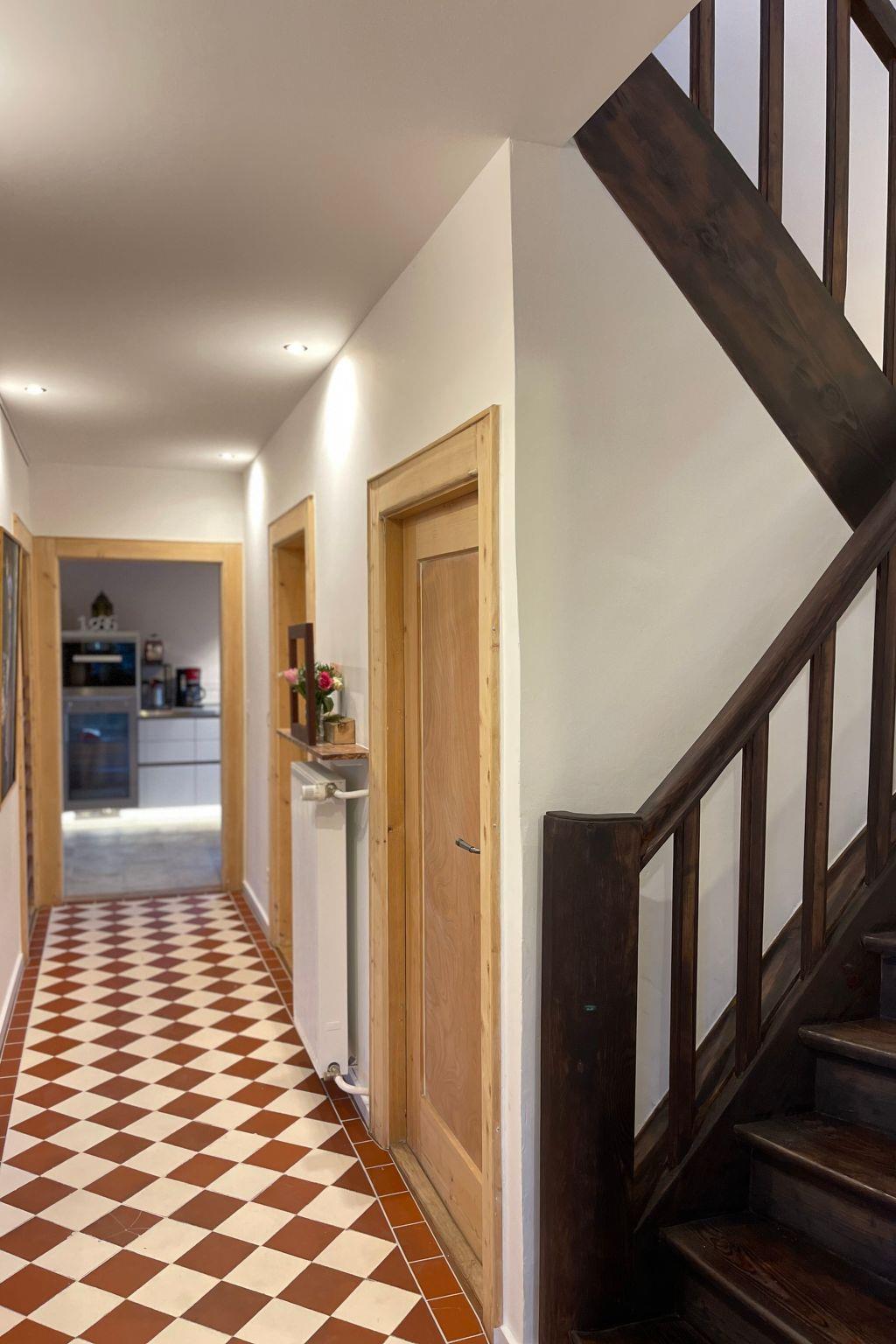 Large living and dining area with original floors made of traditional solid herringbone parquet or high-quality parquet flooring in oak in the living and dining area. Stone floor tiles in the kitchen, original cement tiles in the hallway.