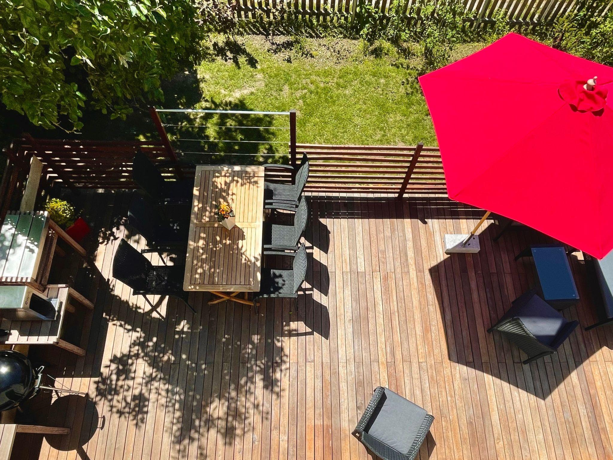 Extremely spacious terrace made of solid Guyana teak planks with an area of approx. 25 square metres. Lounge with 8 seats, two lounge tables, two parasols. Teak dining table with 6 seats.