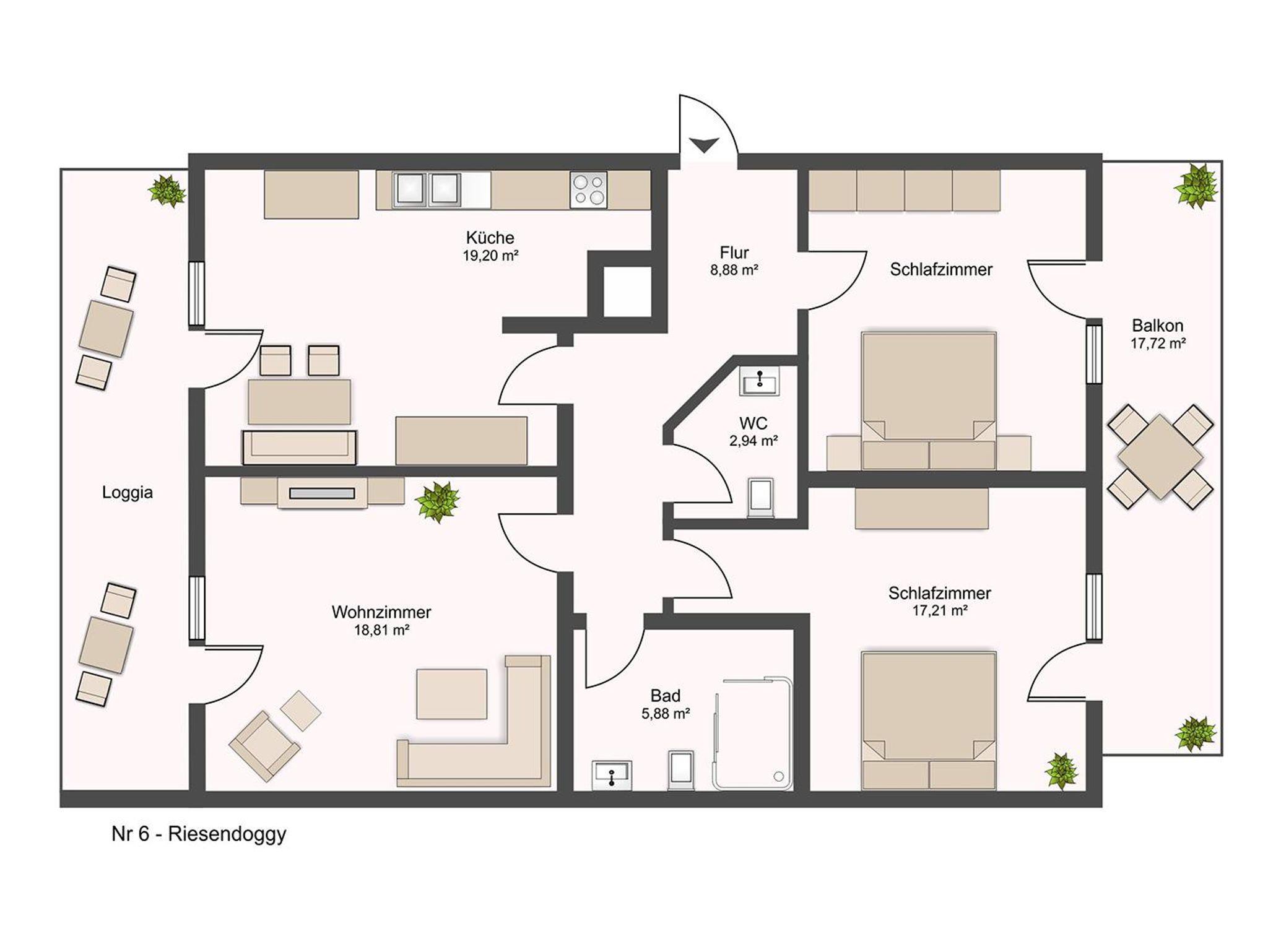 Ferienwohnung Riesendoggy Allgäu Feeling pur 3 Balkone für den besten Blick Die große, helle Ferienwohnung Riesendoogy begeistern mit ihren 3 großen Balkonen, von denen Sie einen atemberaubenden Blick haben. Der ca. 20 m² große Südbalkon/Loggia lädt mit seinem Essplatz und der Relax-Lounge zum verweilen ein.