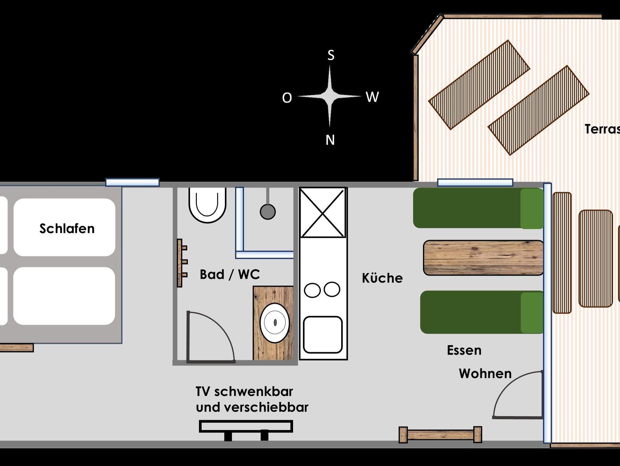In diesem Chalet befinden sich Wohnküche und Schlafen in einem Raum, sowie ein kleines Bad. Dieses Chalet ist mit Zentralheizung ausgestattet.