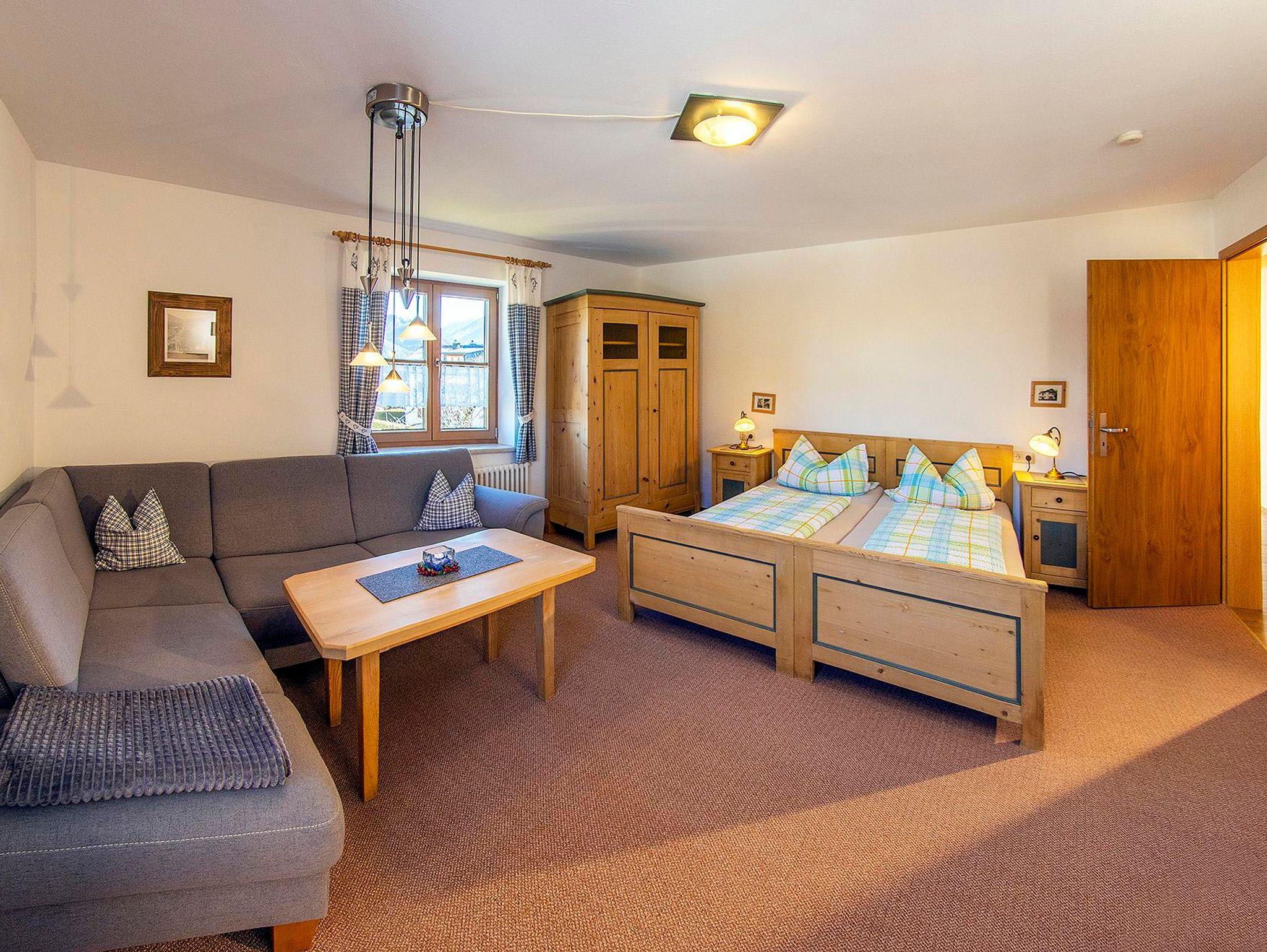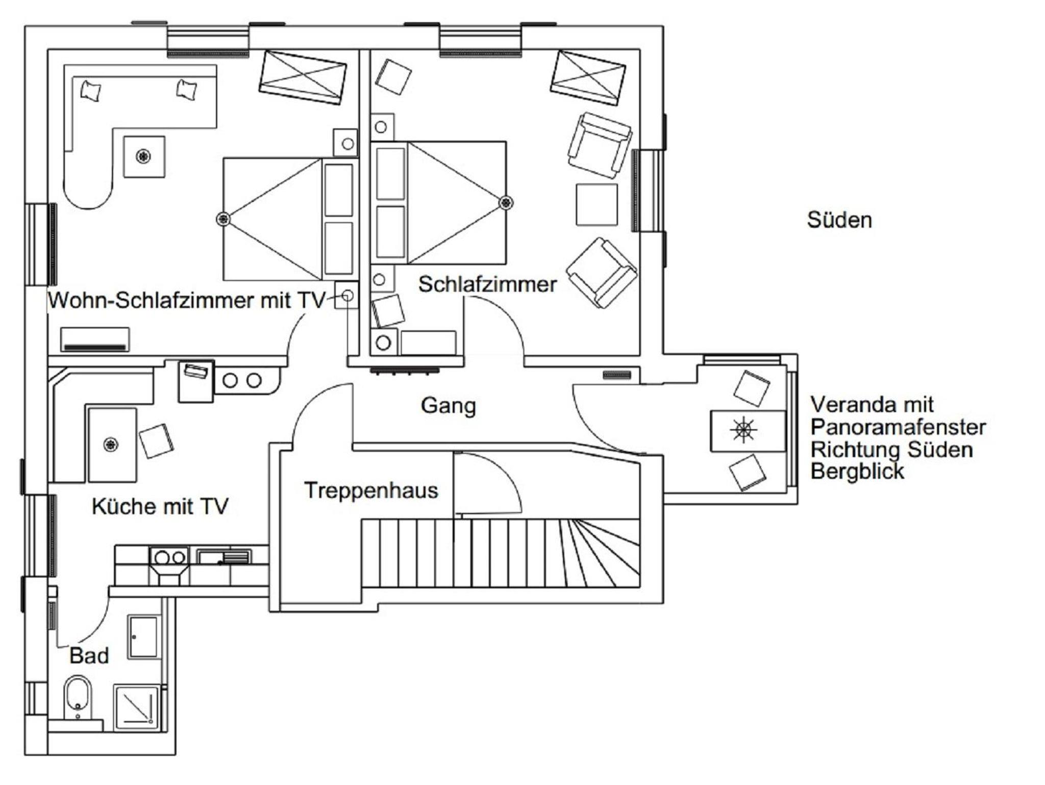 Die großzügige Ferienwohnung bietet auf 52qm Platz für bis zu vier Personen. Sie verfügt über ein Wohn-Schlafzimmer mit einem Doppelbett und einem 40 Flachbildfernseher mit Sat-Anschluss und einem weiteren Schlafzimmer mit einem Doppelbett und einer Sitzgruppe. Die Wohnküche ist mit einem kleinem Fernseher sowie einer Einbauküche mit Kaffeemaschine, Toaster, Wasserkocher, Spülmaschine, Einbaubackofen mit 4-Plattenkochfeld, Dunstabzug und Kühlschrank eingerichtet. Das Badezimmer verfügt über eine Dusche und einem WC. Eine Südveranda mit Bergblick läd zum verweilen und genießen ein. Handtücher und Bettwäsche sowie kostenfreies WLAN sind in der Ferienwohnung vorhanden.