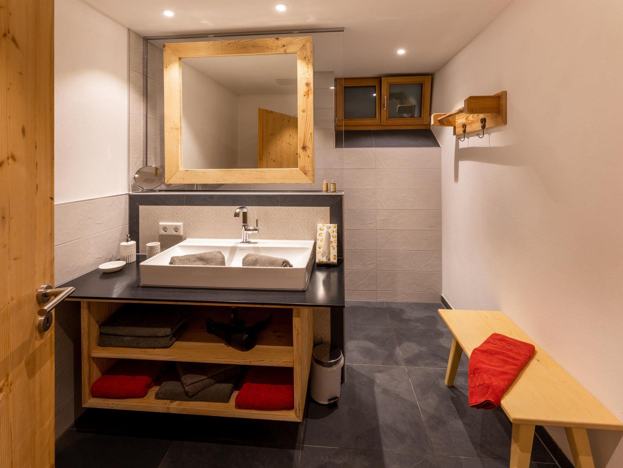 • Badezimmer mit Regendusche, WC, Föhn, Hand- und Duschtücher, Toilettenartikeln