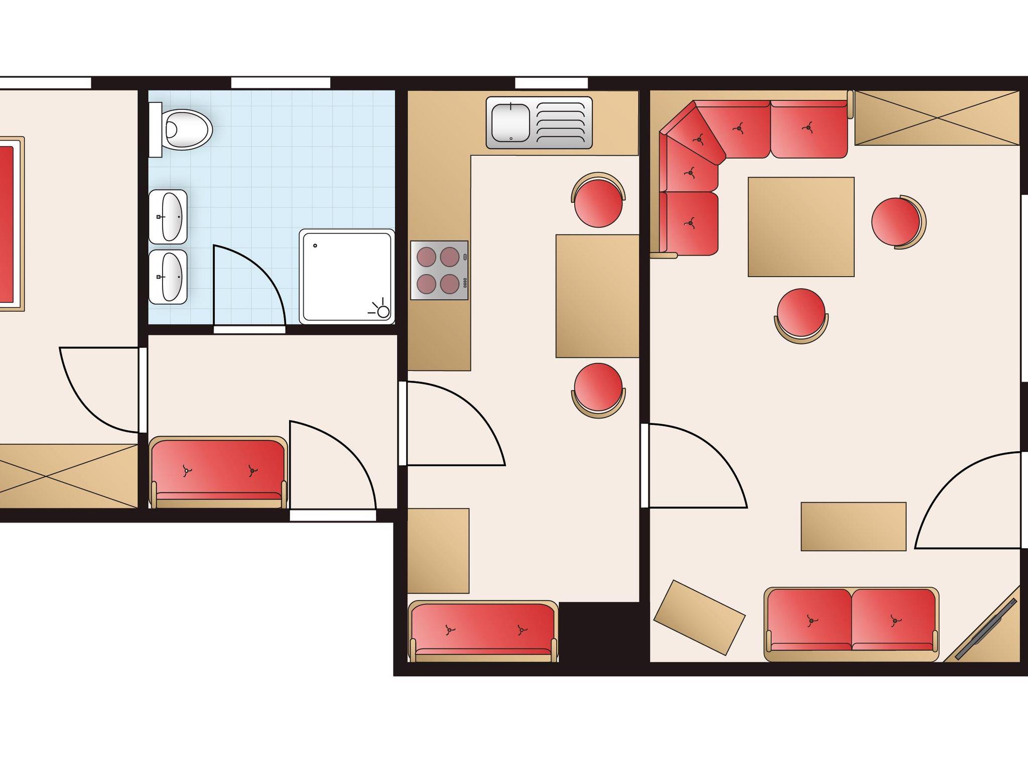 1 Wohnraum mit Sitzecke, Sofa, SAT-TV, Radio/CD, WLAN, Terrasse;