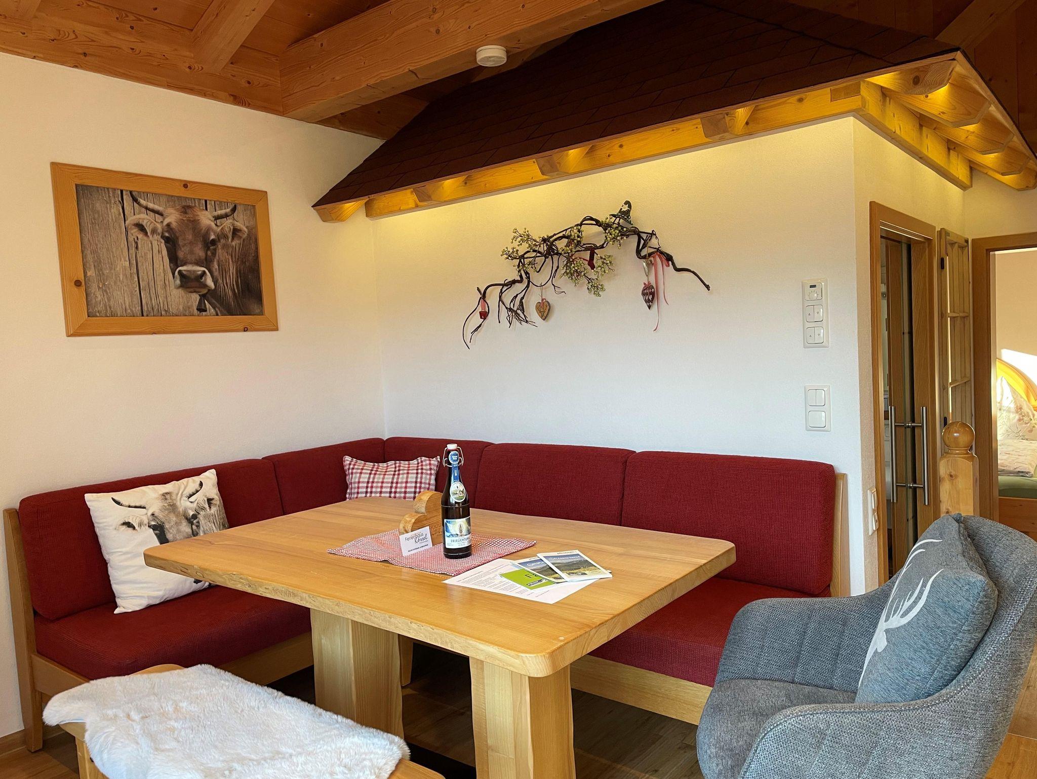 Zur Ferienwohnung Himmelreich (51m²) gehört ein Südbalkon mit Blick auf die Pfrontener Berge. Es erwartet Sie eine moderne, im alpinen Stil hochwertig eingerichtete Wohnung mit offenem Sichtdachstuhl aus warmen Allgäuer Fichtenholz. Zur Wohnung gehört eine große Wohnessecke, eine komplett eingerichtete Küche mit Geschirrspüler, Kaffeemaschine, Nespresso-Maschine, Wasserkocher, Toaster, Backofen und Mikrowelle sowie ein Doppelschlafzimmer und ein geräumiges Einzelschlafzimmer. Das helle Badezimmer ist mit einer modernen ebenerdiger Dusche und WC ausgestattet. Zusätzliche Schlafmöglichkeiten für Kinder und Jugendliche auf Anfrage im kleinen Himmelreich möglich.