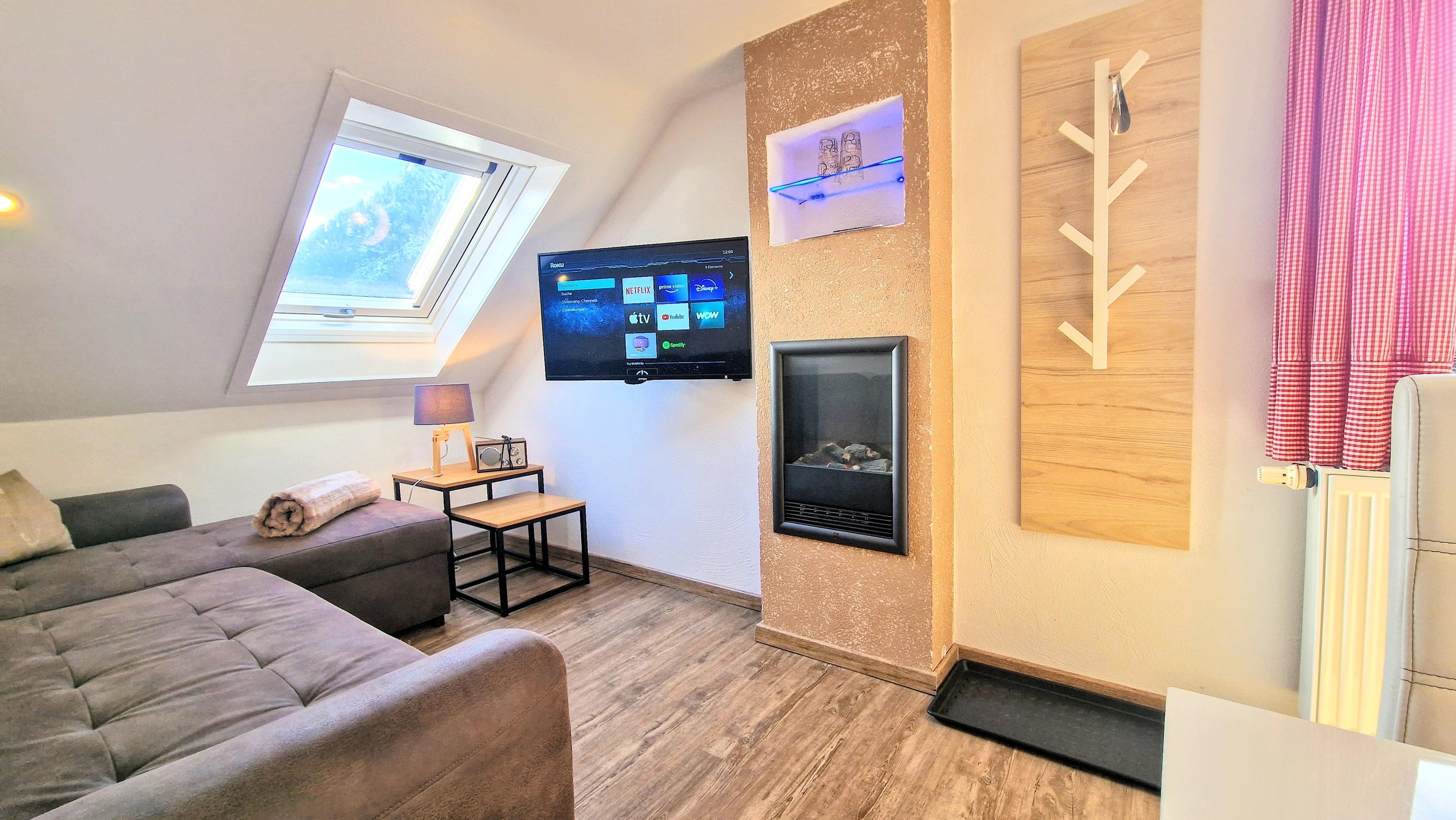 Gemütliche-Ferienwohnung mit ein Schlafzimmer + eine Galerie, ein Wohn./ Essbereich mit Küche, Schlafsofa und Flachbild-TV. , kleines Bad mit Dusche, Süd Balkon mit Bergpanorama.