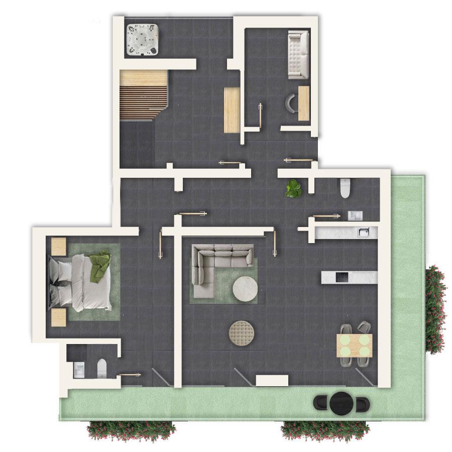 Genießen Sie puren Luxus und völlige Freiheit in unserer Wildgrün Suite. Eine private Sauna und der Whirlpool laden zu entspannten Momenten ein.