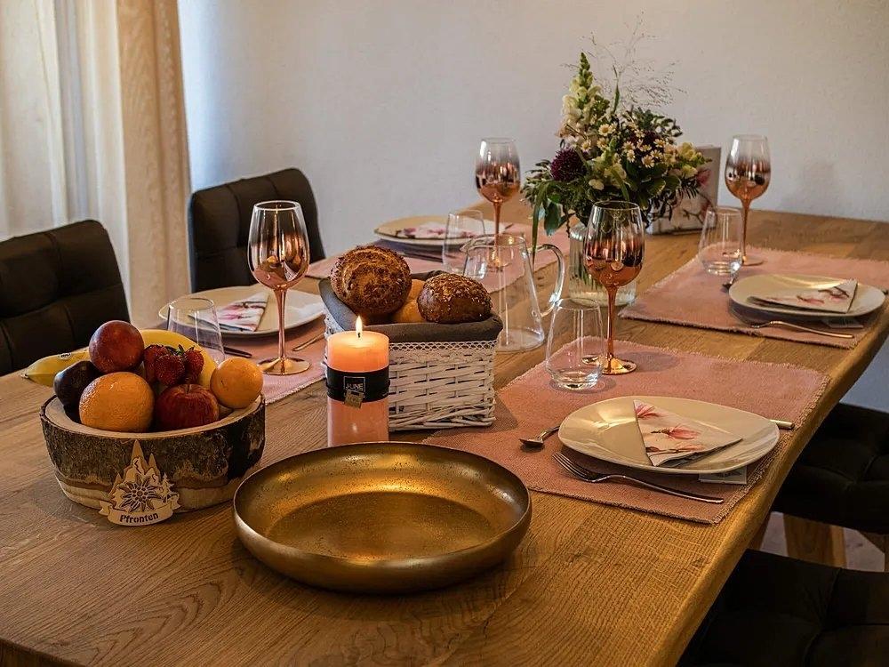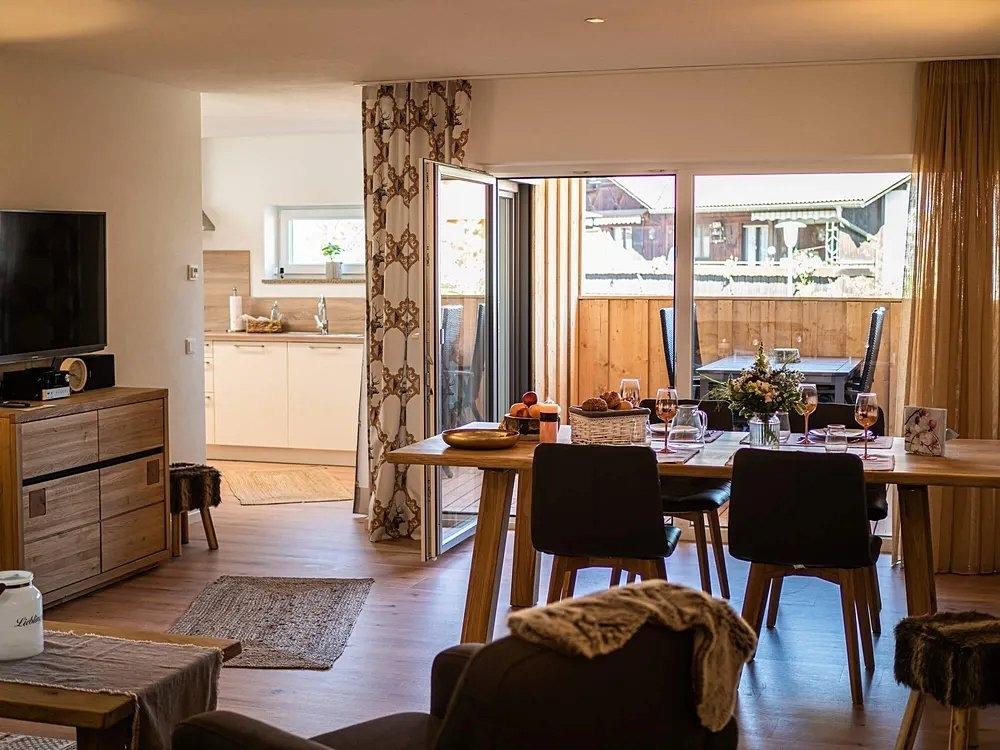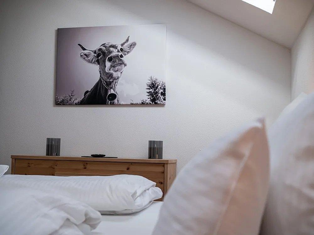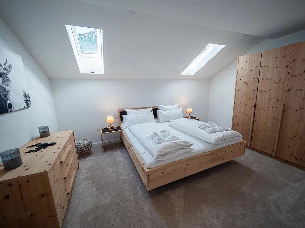 Dreizimmerwohnung im Obergeschoss mit zwei Schlafzimmern, ein Schlafzimmer mit Zirbenholzbetten, ein Schlafzimmer mit einem Doppelbett bzw. zwei Einzelbetten, ebenso aus Zirbenholz für Kinder und einem Waschbecken mit Spiegel. Die Königscard ist für alle Gäste im Preis enthalten. Mit ihr können Sie 200 attraktive, kostenlose Angebote in der Region nutzen.