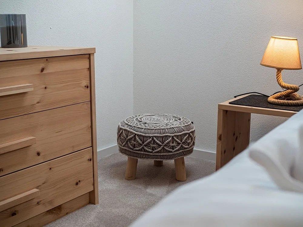 85 qm Dreizimmerwohnung im Obergeschoss mit zwei Schlafzimmern, ein Schlafzimmer mit Zirbenholzbetten, ein Schlafzimmer mit einem Doppelbett bzw. zwei Einzelbetten, ebenso aus Zirbenholz für Kinder und einem Waschbecken mit Spiegel.