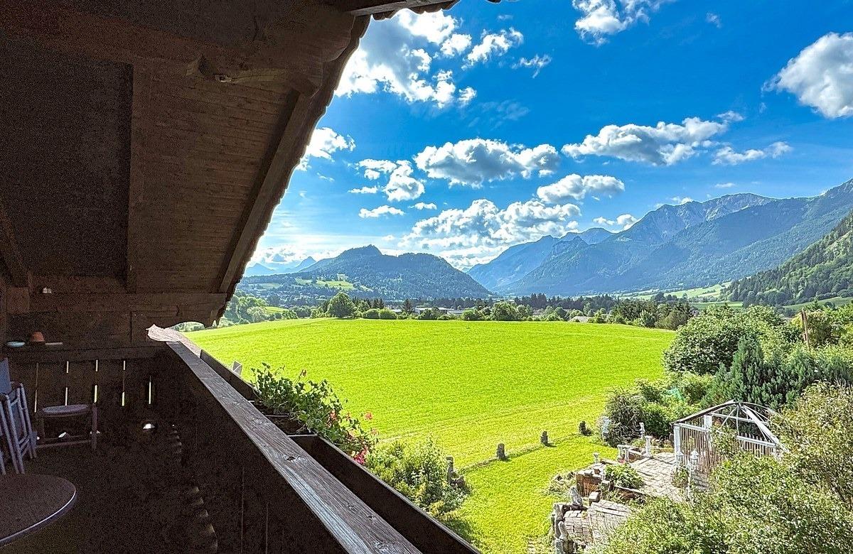 Am Nachmittag lädt der Südbalkon zum Entspannen mit Kaffee und Kuchen ein – mit traumhaftem Bergblick und der ruhigen Allgäuer Natur als Kulisse.