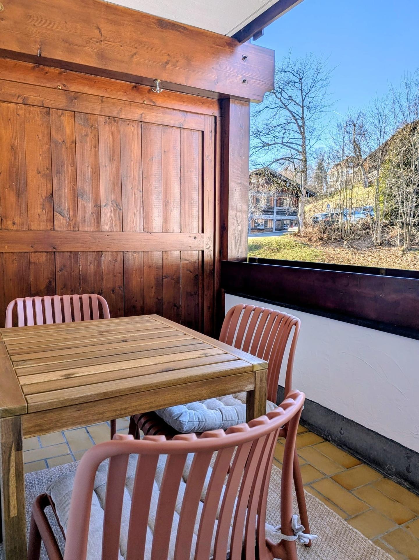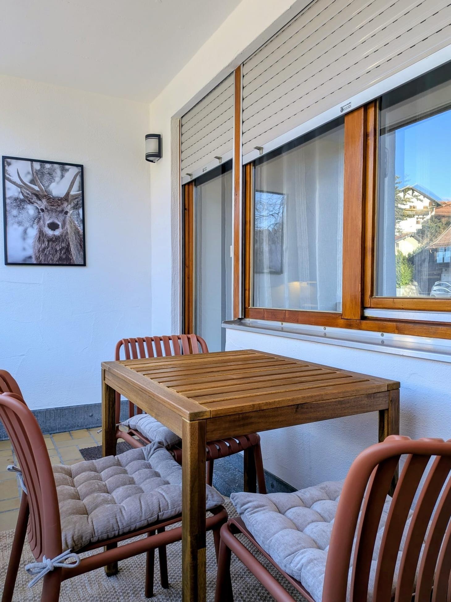 Eine großzügige Loggia mit Tisch und Stühlen bietet Platz für bis zu drei Personen. Ein privater, kostenloser Tiefgaragenstellplatz ermöglicht komfortables Parken, besonders angenehm in den Wintermonaten.