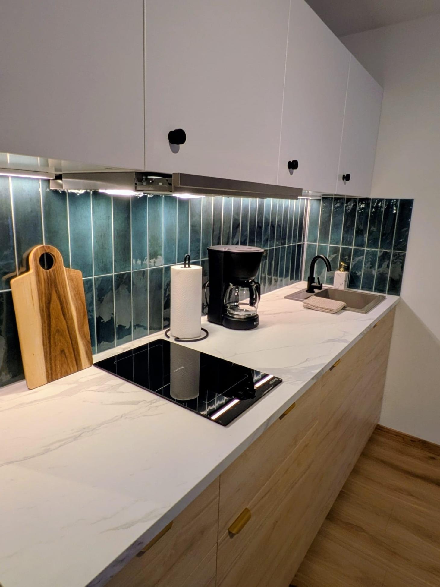 Die Küche ist vollständig ausgestattet und verfügt über eine Grundausstattung für die Zubereitung kleiner Mahlzeiten (Salz, Pfeffer, Öl, Zucker, Kaffeepulver sowie Filter für die Kaffeemaschine). Geschirrtücher sowie Spülmittel und Zubehör zum Abspülen sind ebenfalls vorhanden.