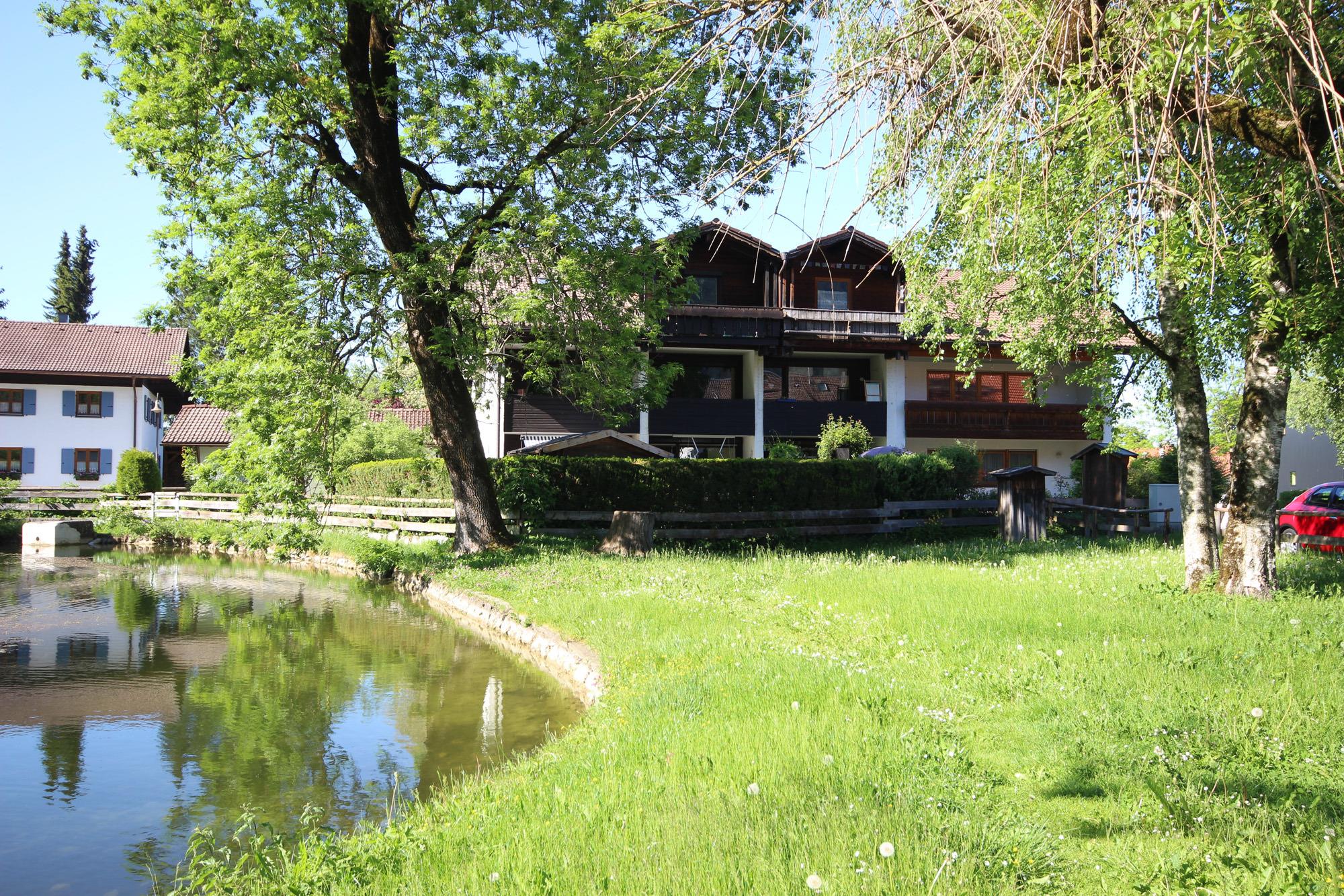 Balkon mit Bergblick und Blick zum Dorfweiher, im Schutz der Bäume