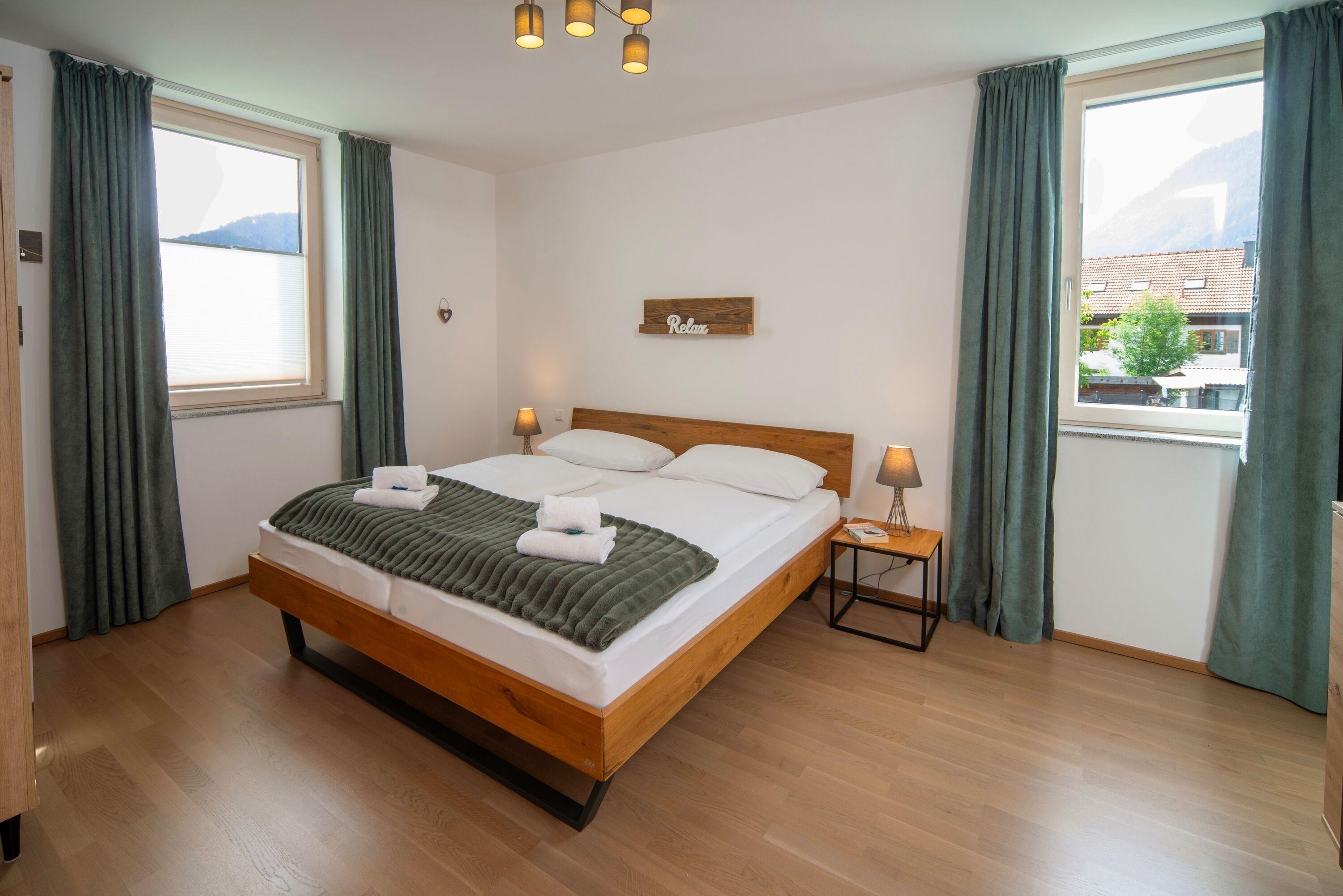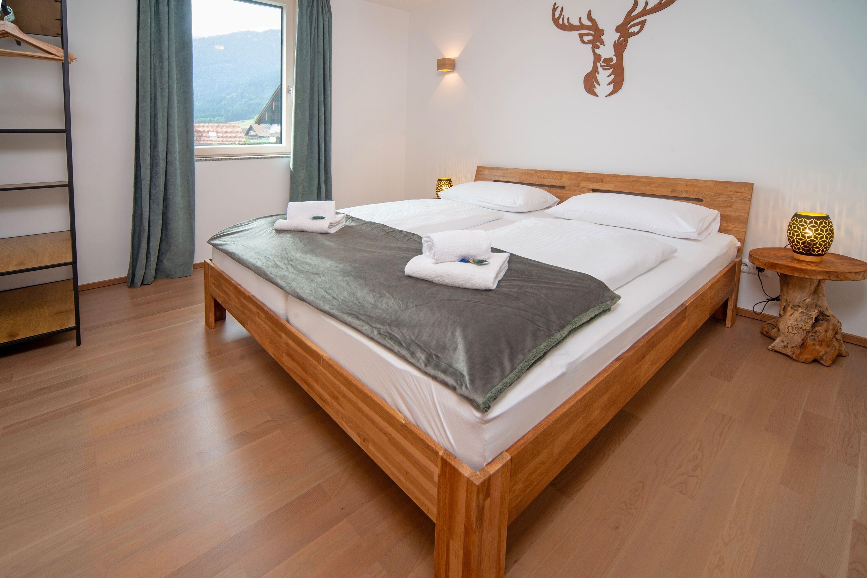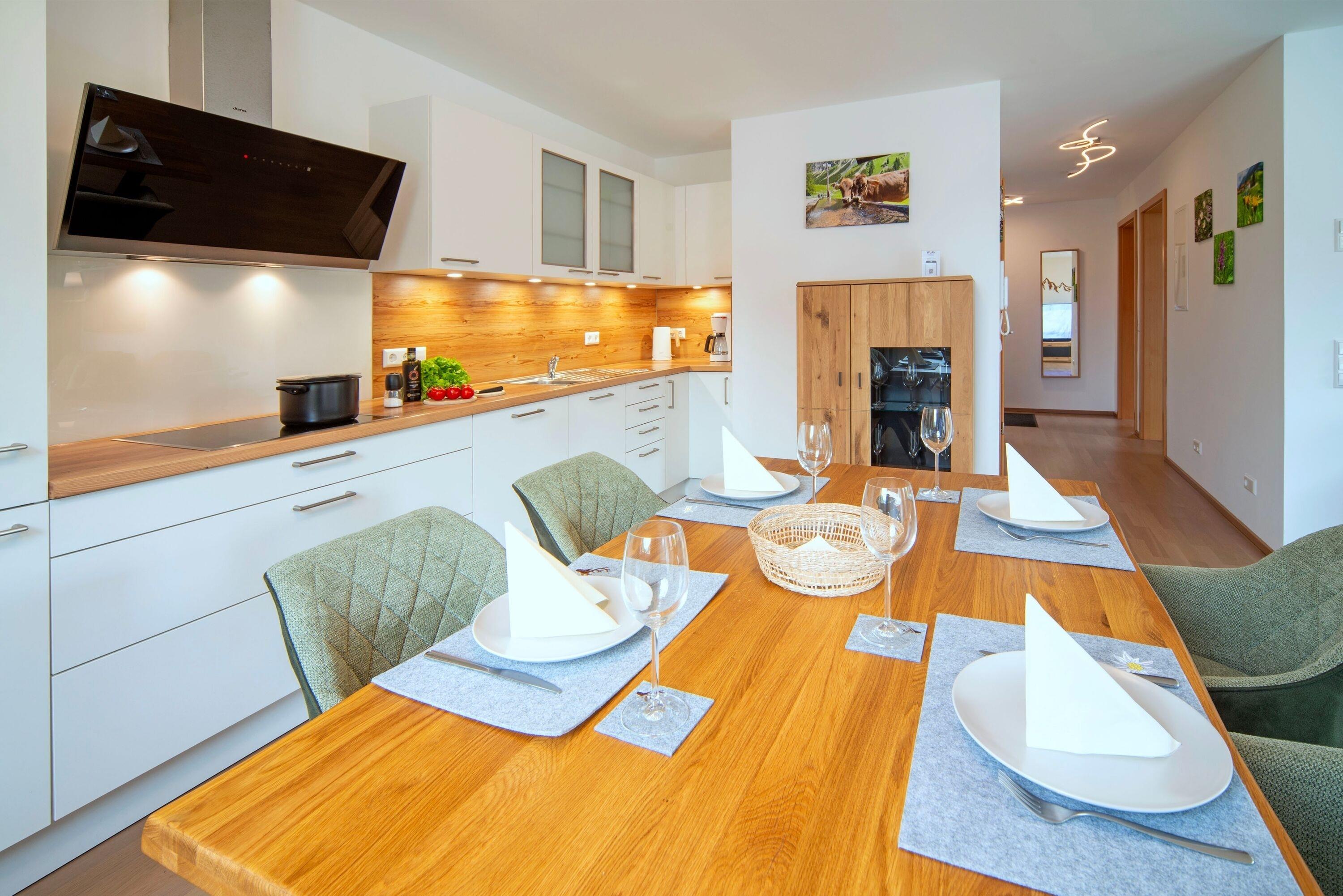 Freuen Sie sich auf zwei großzügige Doppelschlafzimmer mit hochwertigen Matratzen (180x200 cm) und guter Ausstattung. Verdunkelungsvorhänge und Fliegengitter sorgen für ruhige Nächte. Stauraum bieten Kleiderschränke und Kommoden. Kochen [&] Genießen in der offenen Wohnküche. Die moderne Küche ist voll ausgestattet mit Spülmaschine, Ceran-Kochfeld, Backofen, Kühlschrank, zusätzlichem Gefrierschrank sowie reichlich Geschirr und Küchenutensilien – ideal für gemeinsame Kochabende. Der lichtdurchflutete Wohnbereich im modernen alpinen Stil mit Echtholz-Parkett lädt zum Verweilen ein. Eine große, gemütliche Couchlandschaft, ein 65-Zoll-Smart-TV und eine hochwertige Soundbar mit Bluetooth-Streaming sorgen für Unterhaltung. Der Essbereich mit Echtholz-Tisch bietet Platz für vier Personen. Ein modernes Tageslichtbad für Ihre Wellness-Momente mit ebenerdiger Echtglas-Dusche, Fußbodenheizung, ein elektrischer Handtuchwärmer sowie stilvolle Sanitärausstattung schaffen ein angenehmes Ambiente.