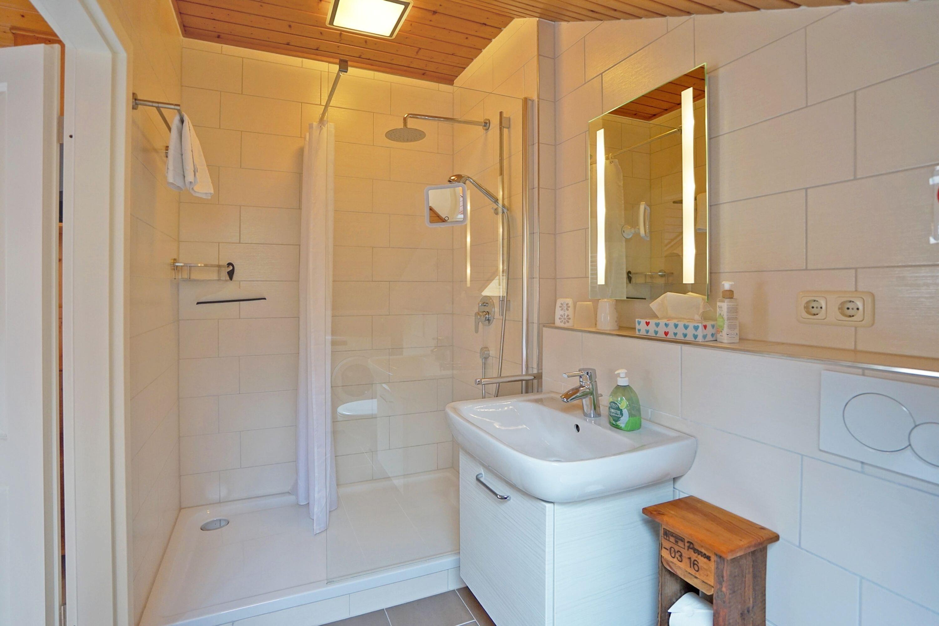 Bad mit Dusche, Waschbecken, WC, Kosmetikspiegel, Föhn, Waschmaschine und