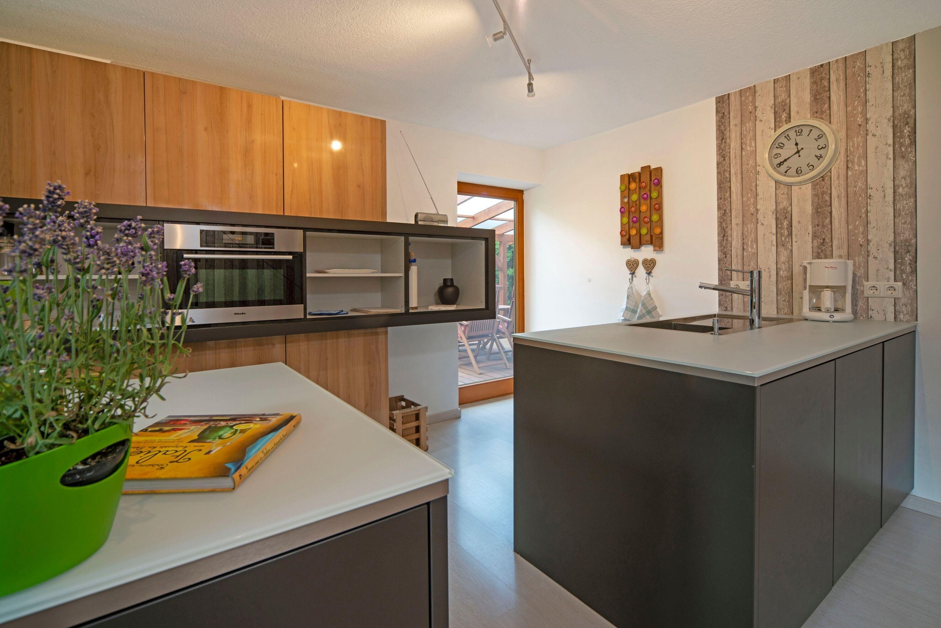 luxuriöse Einbauküche mit Filterkaffeemaschine, Backofen, Spülmaschine, Toaster,